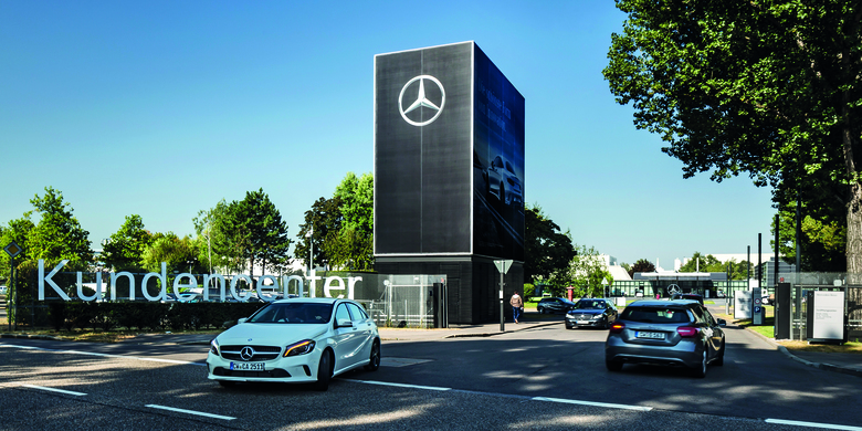 Bereits von der Autobahn aus erzeugt das neue Kundencenter Aufmerksamkeit für das wichtigste Werk von Mercedes-Benz. Denn das ehemalige Pförtnerhaus wurde zur fernwirksamen Inszenierungsfläche für wechselnde Kampagnenmotive. Auf der Piazza vor dem Kundencenter finden im Sommer zahlreiche Events und Präsentationen statt, der prägnante freistehende Stern macht das Markenzeichen von Mercedes-Benz nahbar und wird in unzähligen Selfies und Erinnerungsfotos weltweit geteilt.