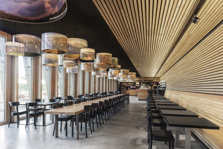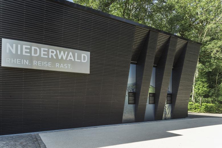 Beim Eintritt in das Besucherzentrum werden die Gäste thematisch und geografisch an den Ort heran geführt: von einer Übersicht über den Rheinverlauf, über das Obere Mittelrheintal zum Niederwald, bis zu einem Modell des Niederwalddenkmals. Auf »seamless screens« kann der Besucher sich anhand von fotografischen Panoramen auf die Reise über das Obere Mittelrheintal begeben. Im Gastronomiebereich lädt eine lange Tafel dazu ein, sich zur »Rast« niederzulassen. Lampenschirme zeichnen mit 360°-Panoramen den Rheinverlauf von Bingen nach Koblenz nach. Sie verbinden Kommunikations- und Gastronomiebereich sowohl thematisch als auch räumlich.
