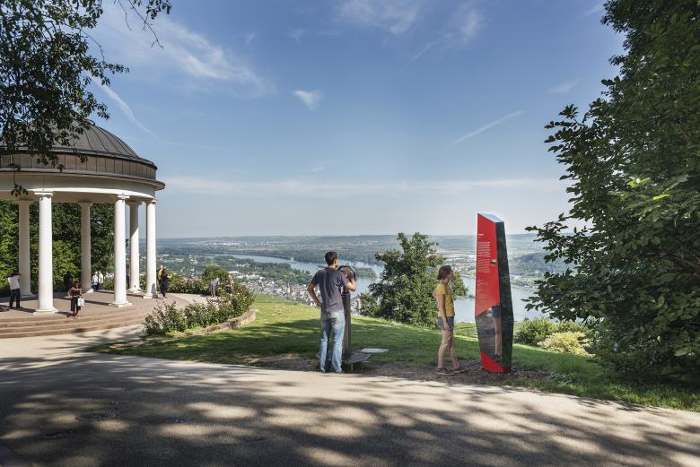 Unter dem Motto »Rhein. Reise. Rast.« wird der Besucher mit auf eine Entdeckungsreise durch die Region und ihre Geschichte(n) genommen. Im Park bietet ein Leitsystem aus Informationsstelen inhaltliche wie räumliche Orientierung. Allseitig verspiegelte Flächen lassen die Stelen fast gänzlich unsichtbar wirken, die Informationsebene hebt sich durch eine rote Trägerplatte hervor.