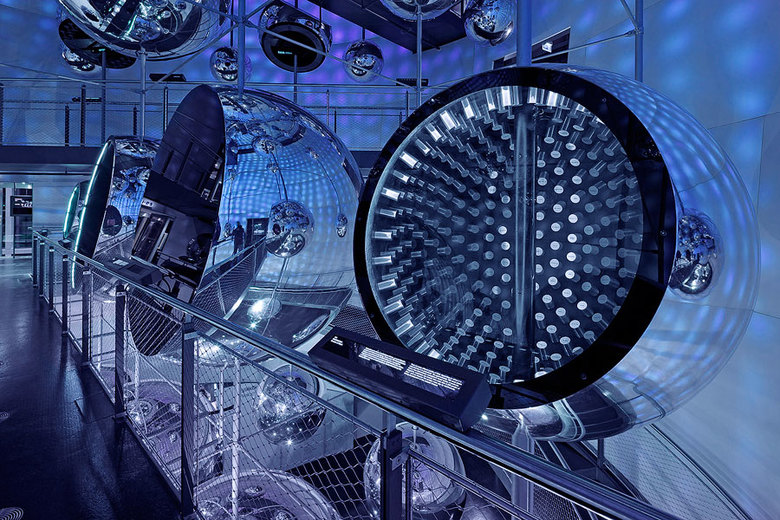 Die Oberflächen der Kugeln sind verspiegelt, so dass sich die Kugeln in sich selbst multiplizieren, was die mannigfaltigen Möglichkeiten des Werkstoffs visualisiert. Durch diese Oberflächenmaterialisierung wird der Besucher Teil der Ausstellung.
