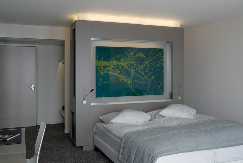 Le soin des détails se remarque jusque dans l’étude de l’aménagement des chambres. Elément majeur la chambre est vécue comme un espace ouvert et fluide, uniquement articulé par le meuble central. Simple et polyvalent, ce meuble concentre toutes les problématiques liées à l’intimité d’une chambre d’hôtel. Servant à la fois de séparation entre zone de nuit et salle de bain, de tête de lit, de rangement, ou de support pour l’éclairage, sa conception linéaire et neutre facilite l’appropriation des lieux par les clients.