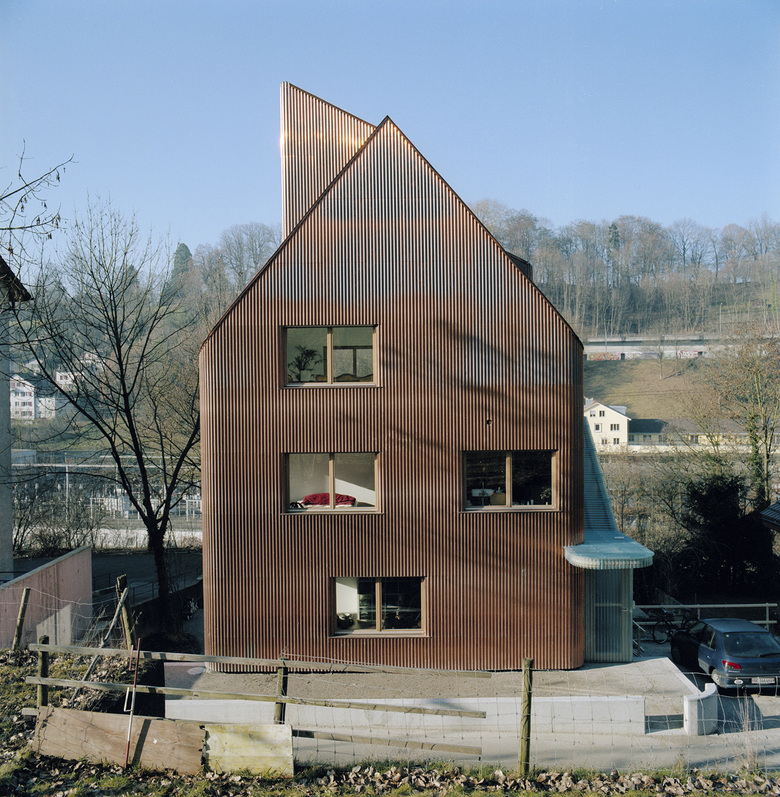 Das Haus befindet sich an der unteren Jurastrasse in Bern in in unmittelbarer Nähe der Aare. In der Umgebung gibt es einerseits eine Schafweide, einen grossen Garten mit Abendsonne, den bewaldeten Hang zur Aare und andererseits die Sicht auf Fluss und Stadt. Die Parzelle wurde 1999 von der Stadt Bern zur Übernahme im Baurecht ausgeschrieben. Das Projekt wurde aus acht Eingaben ausgewählt und hat sich seitdem weiterentwickelt um eine Flexibilität zu erreichen die sowohl unabhängiges wie gemeinschaftliches Wohnen ermöglicht.Das Haus übernimmt die punktuelle Struktur des Quartieres und entwickelt sich auf 80 m2 Bodenfläche in die Höhe wie ein kleiner Turm. Das Gebäudeinnere ist in zwei Wohnungen mit je zwei Stockwerken gegliedert.Der strassenseitige Eingang der Gartenwohnung führt ins Erdgeschoss mit drei Zimmern, Badezimmer und Dusche. Eine Innentreppe führt nach unten ins Gartengeschoss mit Wohnküche und Zugang zum Garten.Die Dachwohnung erreicht man über eine Aussentreppe an der Nordfassade.Im Obergeschoss befinden sich zwei Zimmer und zwei Badezimmer. Die Innentreppe führt ins Dachgeschoss mit Wohnküche in einem offenen Dachraum mit bis zu 6 m Höhe. Eine grosse Dachlukarne im Süden dient der Besonnung des Raumes. Ein Gästebett kann aus der Dachfläche in den Raum der Lukarne geklappt werden. Die zweite Lukarne im Norden bildet den Essplatz mit Aussicht auf das Aaretal. Auf der Gartenseite liegt der grosszügige Balkon.Die Tektonik drückt die vorstädtische Atmosphäre des Quartieres aus. Das Gebäude ist vom Sockel bis zum First mit Kupferwellblech überzogen. Das Kupfer hat sich innert Jahresfrist ins Dunkelbraun gewandelt und wird sich weiter wandeln.