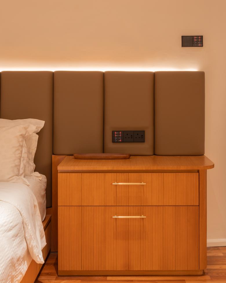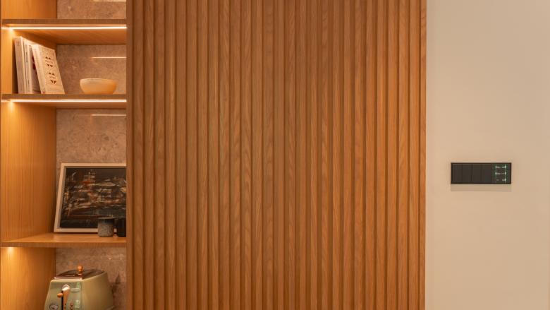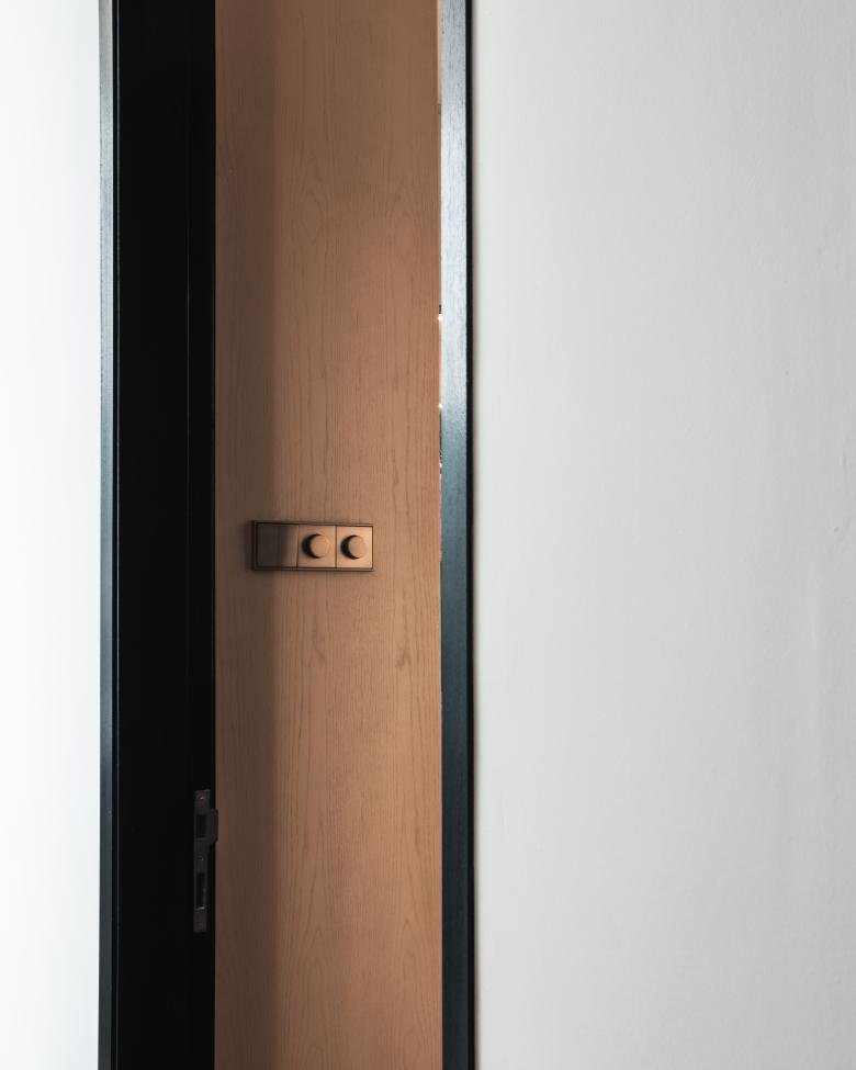 Das Lichtdesign von Studio Nimmersatt verstärkt diese Wirkung: Verdeckte LED-Leisten, gezielte Spots und dimmbare Zoneninszenierungen schaffen je nach Tageszeit unterschiedliche Raumbilder – von funktional bis stimmungsvoll. In das durchdachte Gestaltungskonzept fügen sich auch die Bedienelemente von JUNG ein. Zum Einsatz kommt die Schalterserie LS 990 in Schwarz, die sich dezent in die reduzierten Innenräume einfügt. In Bereichen mit höheren Anforderungen an Lichtsteuerung und Szenengestaltung wurden zusätzlich KNX-F-50-Taster verbaut.