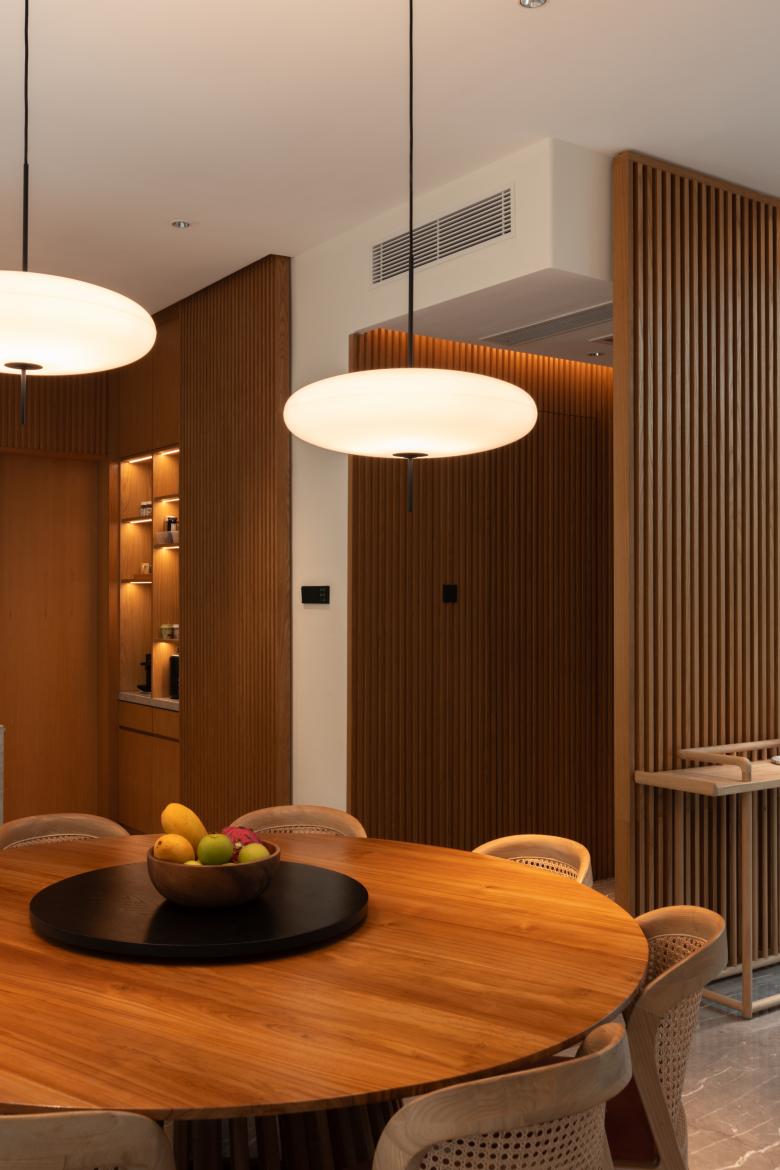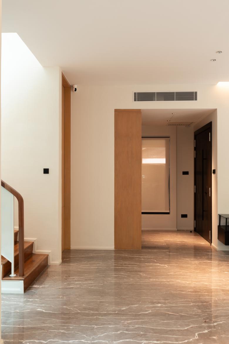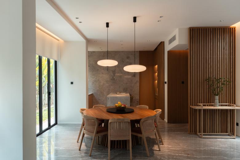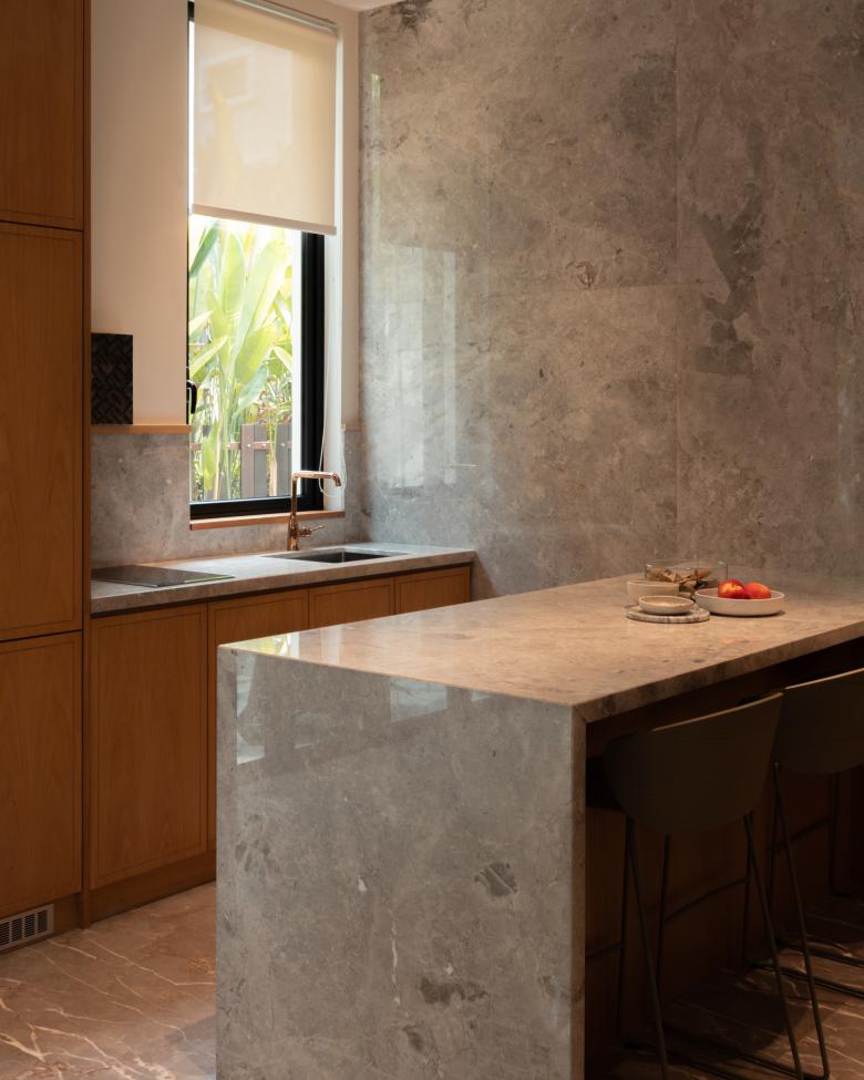 Das innenarchitektonische Konzept von Dwg Studios basiert auf einer reduzierten Materialpalette. Grau marmorierte Steinflächen, vertikale Holzlamellen und maßgefertigte Einbauten in warmen Naturtönen erzeugen eine ruhige, zeitlose Atmosphäre. Holz findet sich in vielen Details wieder – vom Möbelstück bis zur Wandverkleidung – und verleiht den modernen Linien eine weiche Haptik. Großzügige Verglasungen schaffen Sichtbeziehungen zu den grünen Außenbereichen. Transparenz, natürliche Belüftung und gezielt eingesetzte Materialien wie Stein, Holz und Textilien fördern eine angenehme Raumwirkung und ein gesundes Wohnklima. Bereits beim Betreten des Hauses fällt der kontrollierte Umgang mit Licht und Raum ins Auge.