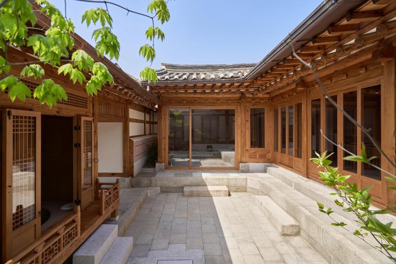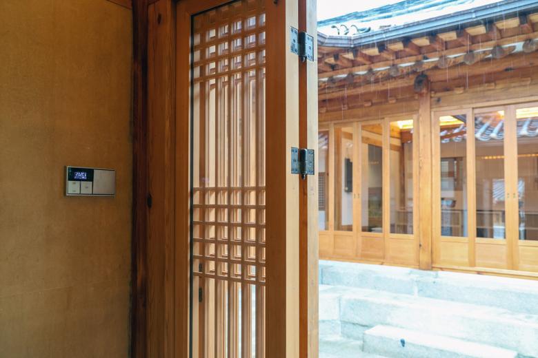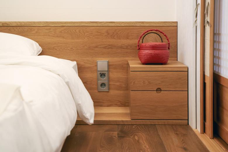 Das Hotelensemble besteht aus zwei benachbarten Häusern mit jeweils eigenem Garten. Das architektonische Konzept basiert auf dem Prinzip der räumlichen Schichtung, was sich in der Abfolge von Innen- und Außenräumen sowie in der Detailtiefe der Materialien zeigt. Fenster, Türen, Böden und Decken wurden mit hohem gestalterischem Anspruch neu interpretiert. Dabei wurde bewusst mit traditionellen Techniken gearbeitet, die durch eine moderne Formensprache ergänzt wurden. Neben handverlesenen Materialien kamen auch eigens für das Projekt geschaffene Kunstwerke koreanischer Künstler zum Einsatz. Das Ergebnis ist ein hanok-inspiriertes Hotel, das den Gästen Rückzug und Ruhe bietet und ihnen zugleich einen Einblick in das zeitgenössische Verständnis koreanischer Wohnkultur ermöglicht. Die Ausstattung wurde bis ins Detail auf das architektonische Konzept abgestimmt. In den Gästezimmern und öffentlichen Bereichen wurden Schalter und Steckdosen der Serie LS 990 in den Ausführungen Edelstahl und Messing Antik installiert. Dank ihrer schmalen Rahmen und fein verarbeiteten Oberflächen fügen sie sich harmonisch in die traditionelle Holzarchitektur ein und unterstreichen die ruhige Eleganz der Räume. Ergänzend wurden SCHUKO®-Steckdosen mit USB-Anschluss installiert – eine praktische Lösung ohne gestalterische Kompromisse für internationale Gäste.