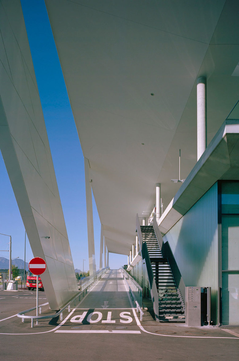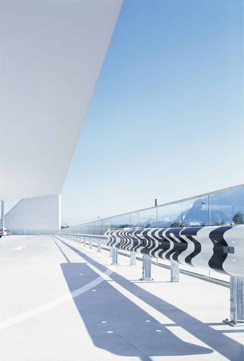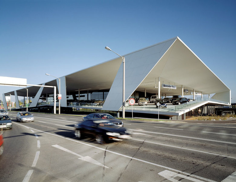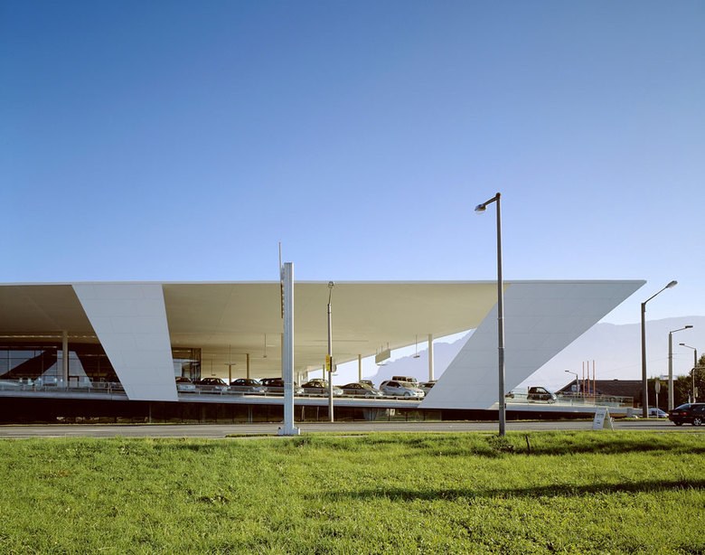 Das Gebäude liegt an einer städtebaulich markanten Einfahrtssituation Salzburgs und wird ausschließlich aus dem vorbeifahrenden Auto wahrgenommen. Die Dynamik und Bewegung des Automobils in das Gebäude hineinzuziehen wird zum konzeptionellen Ansatz. Der Nutzer kann sich im Haus wie auf einer öffentlichen Straße bewegen, durchfahren, parken, aussteigen, umschauen, je nach Bedarf die Autowelt erleben. Alle Nutzungen sind direkt mit dem Auto anfahrbar. Die befahrbare Ebene, das alles überspannende Dach und die Seitenflügel definieren Raum und Erscheinungsform des Verkaufsbereiches, der sich um das glasüberdachte Foyer gruppiert. Die beiden Foyerebenen von Service und Verkauf sind durch eine Rolltreppe komfortabel miteinander verbunden.