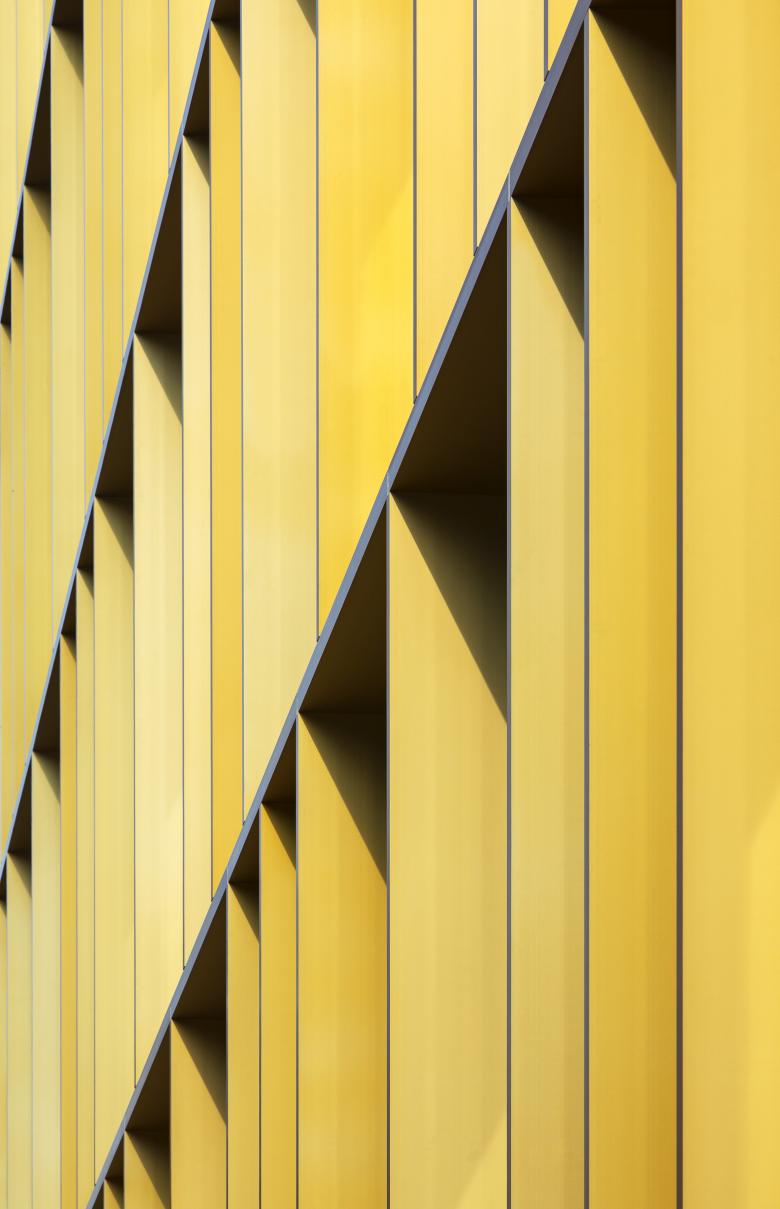 Durch ihre Gliederung nimmt die Fassade Bezüge aus der Nachbarschaft auf, interpretiert sie zeitgemäß und gibt dem Projekt seinen Namen. Angelehnt an die stringente Struktur der Fassaden alter Gewerbehöfe, wirkt die abwechslungsreiche Gliederung wie ein Setzkasten, in dem jede/r Nutzer/in ihren/ seinen eigenen Platz hat. Der warme Goldton der vorgelagerten Fassadenelemente mit außenliegendem Sonnenschutz harmoniert durch seine Lichtreflexionen mit der angrenzenden Umgebung. Über einzelne Loggien fällt das Licht bis tief in den Innenraum hinein und fördert den Dialog zwischen Innen und Außen. Durch die Filigranität und Materialität der Fassaden erhält der Neubau eine ablesbare Identität und behauptet sich so architektonisch in seiner Umgebung. Langfristig offen für verschiedene Nutzungsszenarien, spiegelt das „Stadt-Regal“- die mögliche Nutzungsmischung nach außen hin wider. Das Gebäude öffnet sich mit einer freundlichen Geste zur Prinzenstraße hin und der Stadtraum fließt wie selbstverständlich in den Innenhof. Der großzügige zweigeschossige Gebäudezugang schafft zusätzliche Fassadenfläche im Erdgeschoss und einen überdachten Zugang.