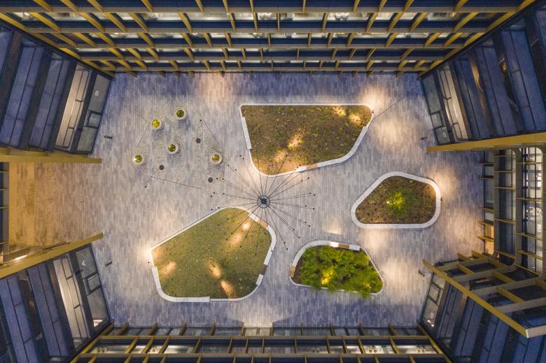 Diese besondere Erschließung trägt dem Berliner Hinterhof Rechnung und führt die langjährige Tradition des historischen Gewerbeareals fort. Die für Berlin typischen zusammenhängenden Hofkomplexe entwickelten sich im Zuge der städtischen Verdichtung zum Ort des alltäglichen Austausches des 19. Jahrhunderts. Dieser Hinterhofcharme soll auf den Neubau übertragen werden. Mit seiner Aufgabe als übergeordnete Lobby erhält der Innenhof durch seine Terrassendecks, die als Sitzmöbel oder Pflanzbecken dienen. zusätzliche Aufenthaltsqualität. Eine besondere Atmosphäre verleiht ihm der von Lichtplaner*innen jack be nimble angefertigte Kronleuchter. Mit 40 Leuchtköpfen ausgestattet und einem Gesamtdurchmesser von acht Metern, überspannt er den gesamten Innenhof.