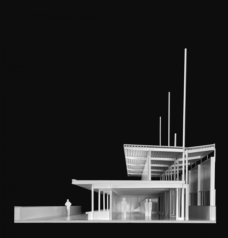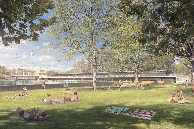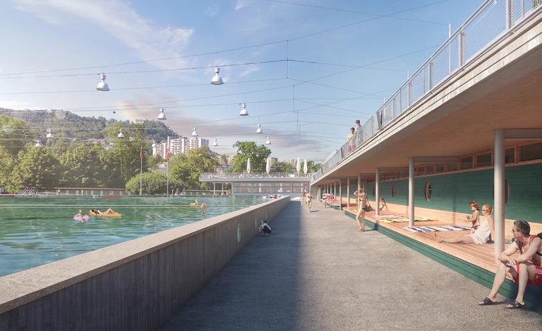 Die Garderobenfläche und die Nasszellen werden optimiert und kompakter organisiert. Die dadurch freiwerdende Fläche soll einen Mehrwert für die Anlage generieren. Das architektonische Konzept der Anlage, zur Strasse geschlossen und zur Natur sich öffnend, wird im Erdgeschoss des Garderobengebäudes aus den 80er Jahren verstärkt, indem die Erdgeschossfassade um 1.70m verschoben wird, um Platz für Liegefläche im Sinne von Holzpritschen zu gewinnen. Die Holzpritschen sind auf Sitzhöhe angedacht, erlauben eine bessere Sicht auf die künstliche Wasserfläche oder auf das Eisfeld des grossen Beckens und erinnern an die ursprüngliche Tribüne an dieser Lage. Auf der freiwerdenden Fläche hinter den Holzpritschen wird mit einem Mehrzweckraum ein Mehrwert für alle Jahreszeiten geschaffen. Die Bullaugen nehmen das Motiv des Ozeandampfers auf und gewährleisten einen Ausblick auf die Wasserfläche.