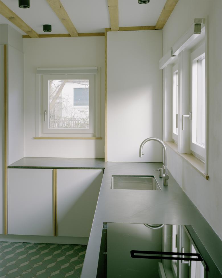 Um zusätzliche Wohnfläche für einen grosszügigen Schlafbereich zu erhalten, wurde das Wohnhaus mit einem höheren Dachgeschoss aufgestockt. Das bestehende Dach inkl. Dachkonstruktion wurde dafür abgebrochen. Anschliessend wurden die Kniewandhöhen auf den Traufseiten auf 1.40m erhöht und ein neues Satteldach in Elementbauweise mit der max. möglichen Dachneigung von 45° ausgeführt. Die Machbarkeitsprüfung von den Bauingenieuren hat ergeben, dass die zusätzlichen Lasten des Aufbaus von den bestehenden Holzaussenwänden aufgenommen werden können. Die Lasten der zwei neuen Stützen, welche die Firstpfette tragen, werden mittels neuen querlaufenden Balken im Bodenaufbau auf die Längsfassaden übertragen. Über der bestehenden Treppe wird ein neuer Treppenlauf in Anlehnung an den Bestand ins Dachgeschoss geführt. Eine Ankleide und ein WC bilden zusammen mit dem Treppenbereich eine Raumeinheit, die durch zwei grosse Schiebetüren vom grossen neuen Zimmer räumlich abgetrennt werden kann. Eine neue grosse Lukarne, gegen Süden orientiert, ermöglicht den Ausblick in den Garten. Das Fenster ist als französischer Balkon ausgebildet. Zwei neue grosse Fenster auf den Giebelseiten ermöglichen einen Ausblick auf die Ost- und Westseite. Im Erdgeschoss wurde eine neue Küche eingebaut und räumlich gegen das Wohnzimmer geöffnet. Dabei wurde der bestehende Kamin, welcher aufgrund des neuen Fernwärmeanschlusses nicht mehr gebraucht wird, in der Küche abgebrochen. Auch im 1. Obergeschoss wurde der Kamin im Kinderzimmer abgebrochen, um die Zimmerfläche zu vergrössern. Die Eindeckung des neuen Dachgeschosses wurde mit einer integrierte PV-Anlage umgesetzt.