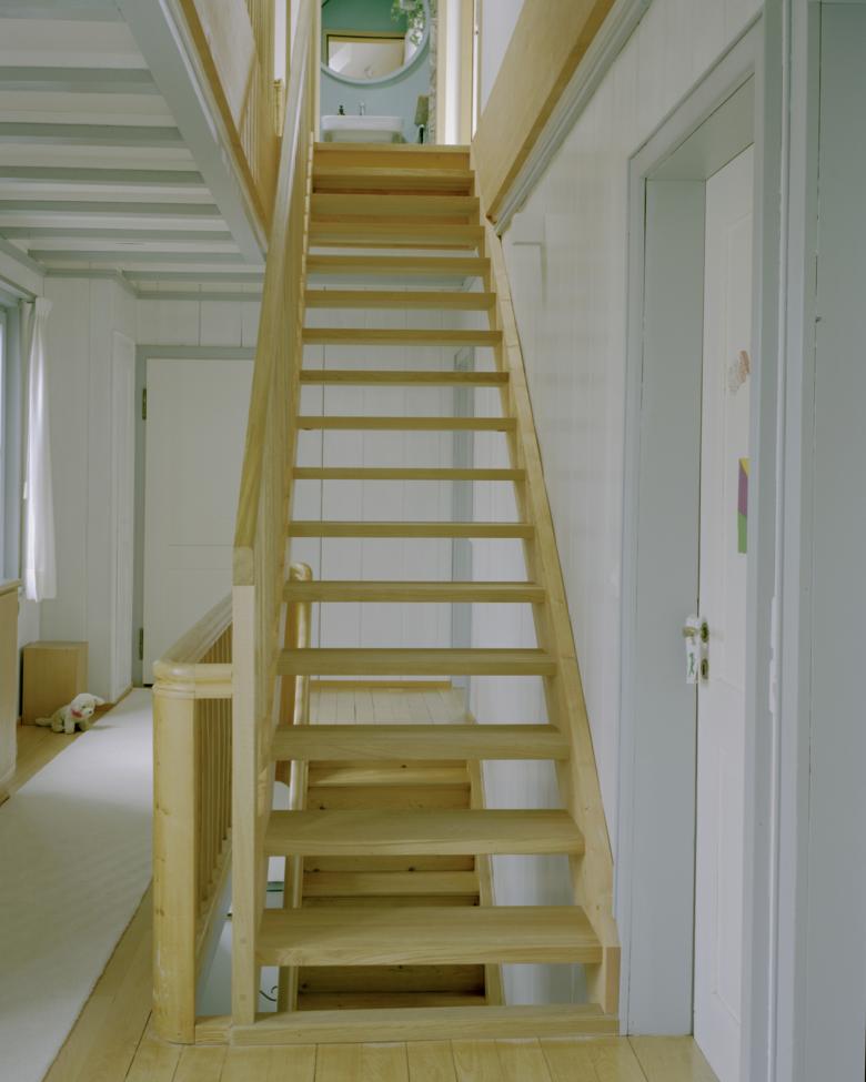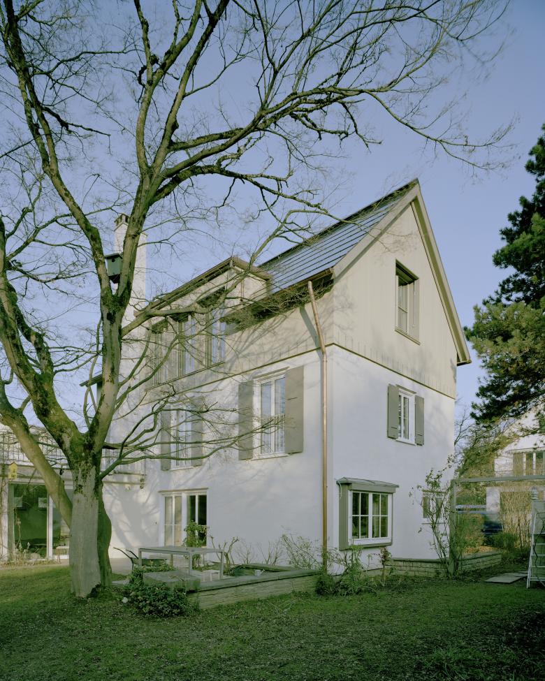 Beim Umbau und der Erweiterung wurde im Innern und Äussern darauf geachtet, dass der bestehende, einfache Charakter des Wohnhauses aus der Nachkriegszeit weitergeführt und transformiert wurde. Durch die vertikale Holzverkleidung des Aufbaus sind die Dimensionen des Ursprungsbaus nach wie vor ablesbar. Der graue Farbanstrich mittels Schwedenfarbe bindet den verputzen Bestand und den Dachaufbau jedoch zu einem neuen Ganzen zusammen.
