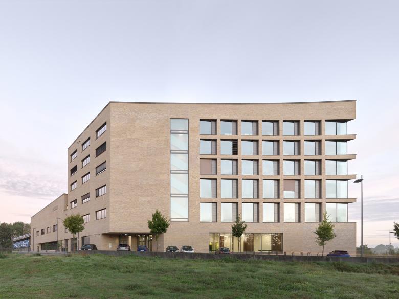 Um der Straßenkrümmung dynamisch zu folgen, wählten die Architekten einen Ziegel und knüpfen damit an die Materialität historischer Elektrizitätswerke an. Der nachhaltige Ziegel versinnbildlicht darüber hinaus den nachhaltigen Aspekt der Forschung und ermöglicht es, das Gebäude auf dem Campus angemessen zu adressieren. Während die Fassade an die Biegung des Boulevards angepasst ist, unterstreicht die architektonische Detaillierung der Fenster mit rhythmisch eingerückten Flächen die Dynamik der Ziegelfassade, ohne die Krümmungen auf das Glas übertragen zu müssen. Vorbeilaufende oder -fahrende Betrachter blicken durch ausladende Fensterfronten auf das Foyer mit angrenzenden Tagungsräumen und die Büros in den Obergeschossen.