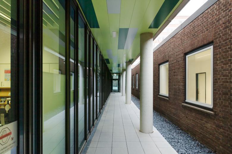 Der langgestreckte Neubau ist in zwei horizontale Zonen eingeteilt: Das Sockelgeschoss ist mit Betonfertigteilen verkleidet, welche einerseits die konstruktive Aufständerung deutlich werden lassen, andererseits mit großen Fensterrahmen Durchblicke auf den Altbau erlauben. Hier sind studentische Lernzonen eingerichtet. Die aufgehenden Geschosse sind als Referenz dem Riphahn-Gebäude gegenüber mit bräunlich-lehmfarbenem Ziegel verkleidet. Die Besonderheit sind die drei differenzierten Ziegelmischungen, die der vertikal gestaffelten Fassade einen subtilen Wechsel in der Farbintensität verleihen.
