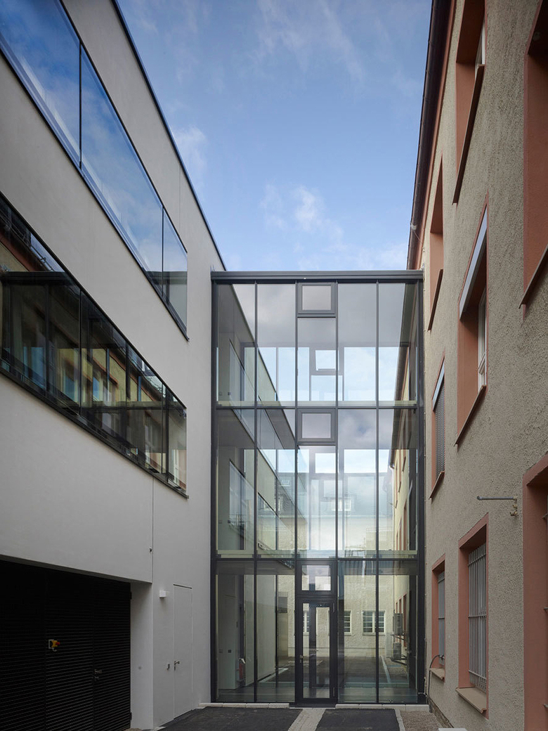 Der dreigeschossige Neubau schließt an den historischen Bestand an. Der Anschluss zu Haus 1 wird mittels einer filigranen Glaskonstruktion geschaffen, durch eine zweite Brücke im Südosten wird das Thema des Übergangs erweitert.