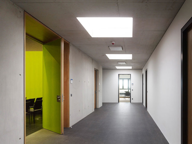 Die Herausarbeitung der abgesenkten Höfe in Süd- und Nordosten verklammert das neu entstandene Ensemble. Die neue Adresse – der Eingang zum Neubau – wird dabei deutlich durch eine Brücke über den südöstlichen Hof formuliert. Prof. Johannes Kister dazu: „Das neue Forschungsgebäude arrondiert das Gelände der Reiche Zeche und stärkt die Adressbildung des Instituts.“