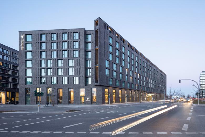 Vor allem durch den Rhythmus der Pfeiler erhält das Gebäude seine Ausstrahlung als Hotel. Deutlich ist dies besonders gut in den Zimmerachsen – hier werden neben einem großen festverglasten Fenster zwei vertikale Pfeiler gleicher Breite eingestellt, welche die Funktion als Hotel auf subtile Weise ablesbar machen. Dieser Grundrhythmus pro Zimmerachse wird als Thema in der Fassadenkomposition in der Horizontalen gespiegelt und vertikal in der Fassadenhöhe gegliedert, so dass sich eine Wandscheibe ergibt, die tektonisch eine ablesbare Gliederung aufweist. Der Versprung in der Fassadenflucht von 40 cm wird zum Thema der Eckformulierung. Durch die körperhafte Reliefwirkung der „Loggienfassade“, die durch eine strukturelle Plastizität in der Überhöhung der Attika gebildet wird, gewinnen die „schrägen“ Anschnitte des Baublockes eine architektonische Ausformulierung. „Die Thematisierung der Ecken aus der Struktur heraus, prägt die städtebauliche Stellung des Hotels an der Überseeallee mit einer gleichermaßen repräsentativen als auch eigenwilligen Fassade, die ganz selbstverständlich Hotel ist“, fasst Johannes Kister zusammen.