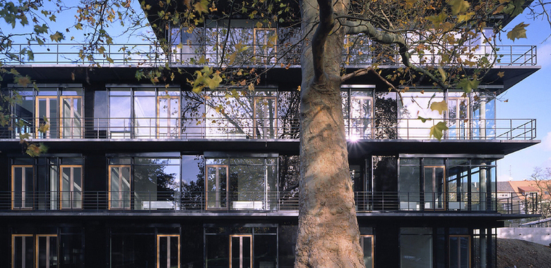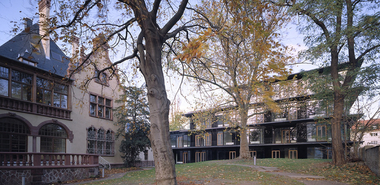 In einem gründerzeitlichen Wohnviertel liegt die ehemalige Fabrikantenvilla mit ihrem Erweiterungsbau inmitten eines großzügigen Parks. Gleich einem Solitär verlangte das denkmalgeschützte Bestandsgebäude vom Neubau einen besonderen Ansatz. So wird das neue Institutsgebäude ebenfalls als Villa definiert und städtebaulich zurückhaltend eingefügt. Das kubische Gebäude öffnet sich mit bodentiefen Verglasungen zu Villa und Park. Auskragende Deckenplatten aus schwarzem Sichtbeton unterbrechen die Glasfassade und lassen es leichter erscheinen.