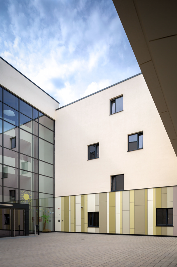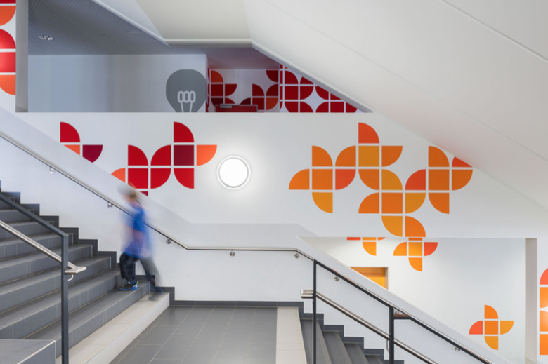 Zu nutzen machen konnten sich die Architekten den vorhandenen Geländesprung von zehn Metern. „Die Topografie war bei diesem Projekt der eigentliche Entwurfsgenerator“, erläutert Johannes Kister. „Foyer und Wegeführung ergaben sich aus der Höhensituation, die Lernhäuser mussten auf das oberste Niveau nach Süden, die Fachräume in den Riegel nach Norden. Mit den breiten Treppen haben wir die Topografie zusätzlich inszeniert und Aufenthaltsbereiche geschaffen.“