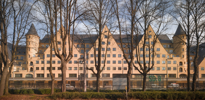 Lange Zeit galt das 1908-09 von Hans Verbeek errichtete Gebäude mit seinem Betonskelett nicht sanierbar. Insbesondere die große Gebäudetiefe in Verbindung mit niedrigen Geschoßhöhen stellte die Frage nach ausreichender Belichtung und erfolgreicher Vermarktung. Das Gebäude verlangte eine Sanierung, die zum einen den Gebäudecharakter respektiert und zum anderen die Nachhaltigkeit der Nutzung garantiert. Um die Eingriffe in den Denkmalbestand auf ein Minimum zu reduzieren, verzichteten kister scheithauer gross auf den gern praktizierten Einbau von Lichthöfen. Vielmehr schufen die Architekten durch intelligente, offene Grundrissanordnungen sowie innenliegende, gläserne Loggien großzügige Wohnwelten am Wasser. Insgesamt entstanden auf acht Ebenen über 130 Wohnungen sowie attraktive Gewerbeflächen in der Erdgeschoßzone entlang Kölns neuer Flaniermeile.