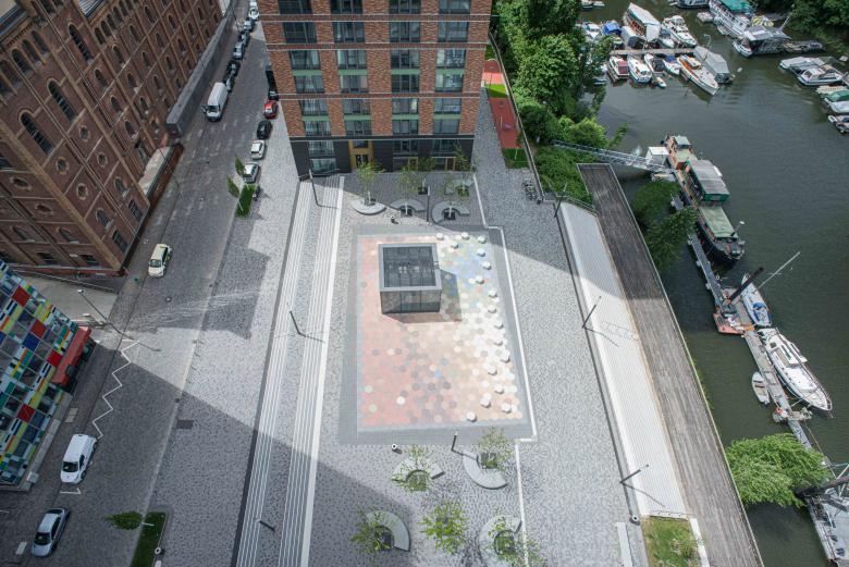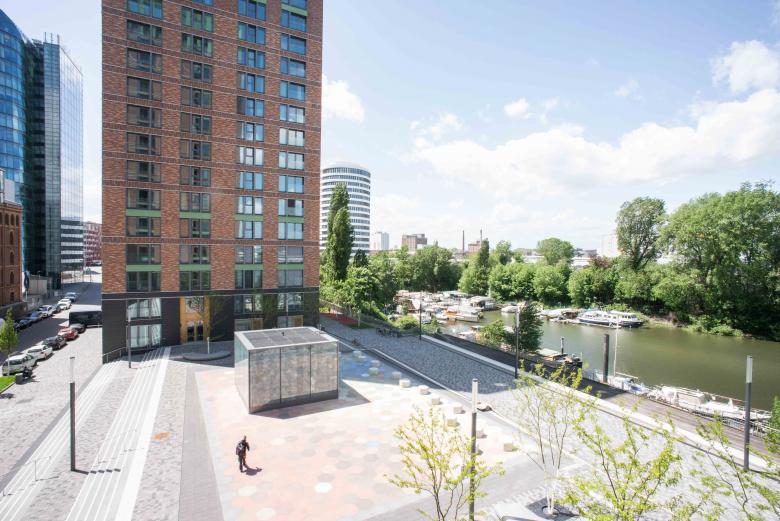 Der Zugang zu den Hochhäusern erfolgt auf der hochwassersicheren Platzebene mit Ausrichtung zum Platz. Erdgeschossig sind jeweils in beiden Hochhäusern zum Hafenbecken Möglichkeiten für Gastronomie vorgesehen, die sich auf den Platz ausdehnen kann. Zur Speditionstraße werden Wohnungen angelegt, die durch die Höhenlage nicht von der Straße eingesehen werden können.