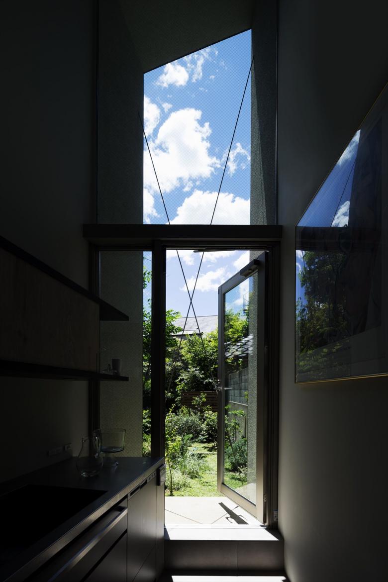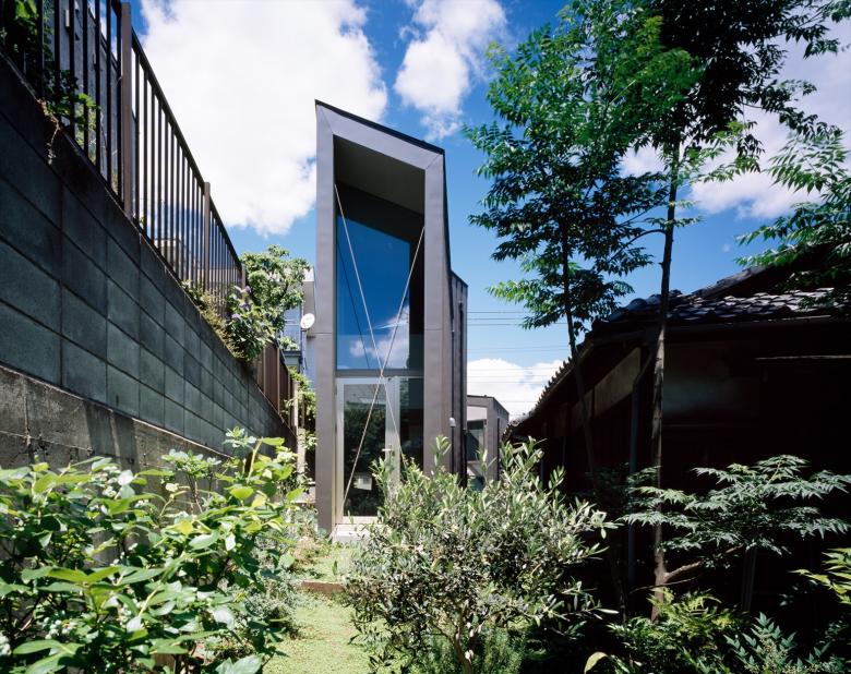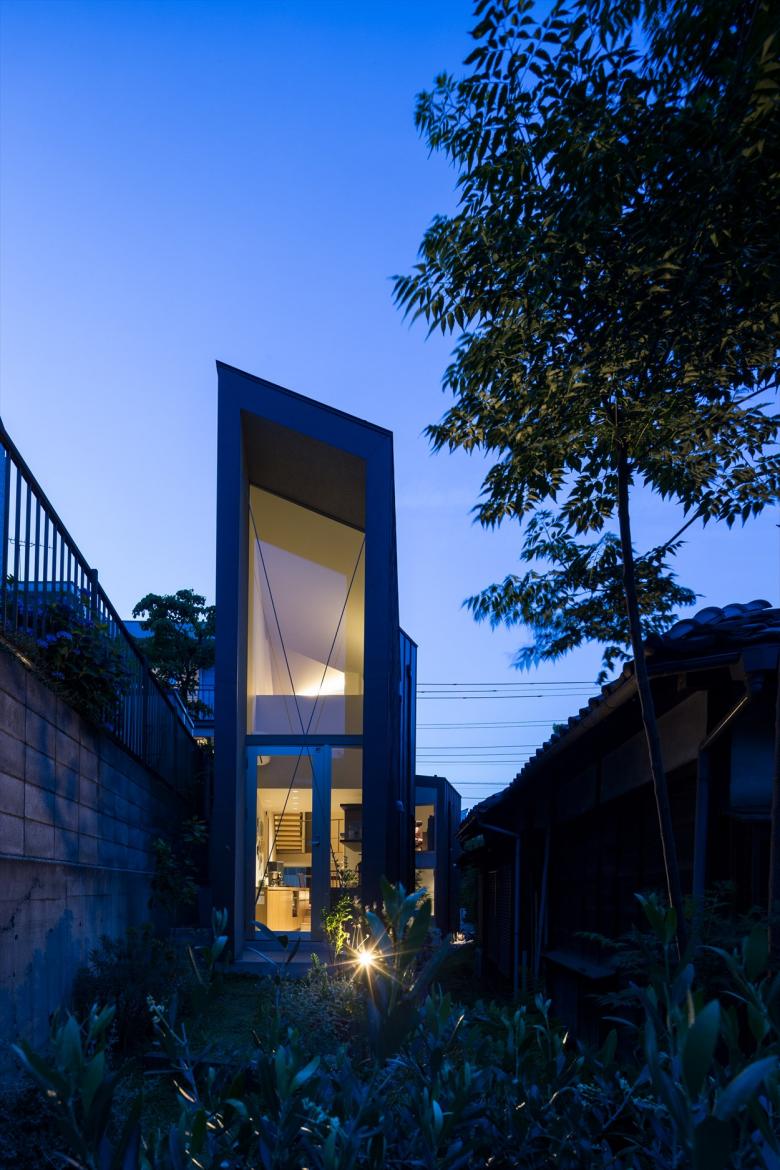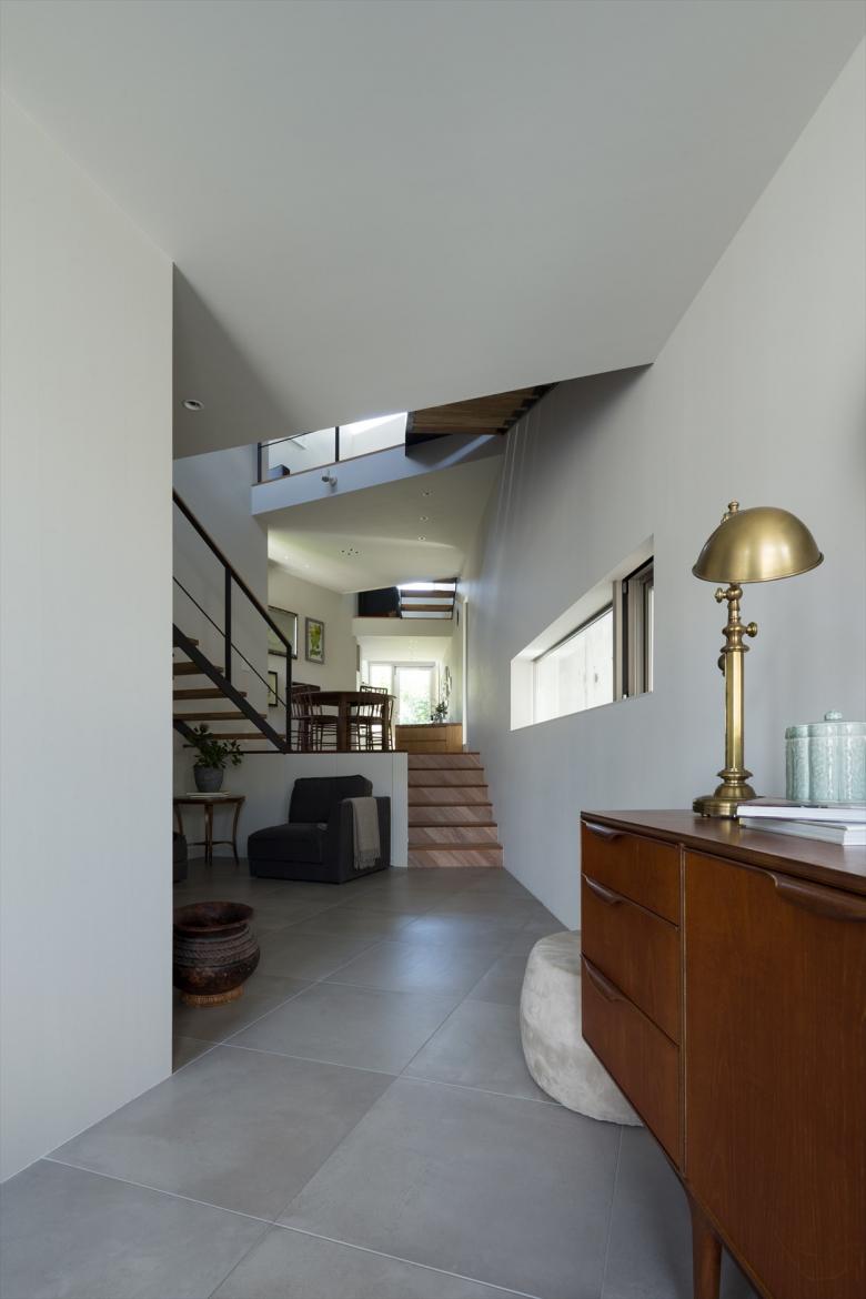 Gaps in the City - the house is built in a north-south elongated and distorted strip of land with the afterimage of uneven landscape with less than 2meter frontage at the shortest point. Towards the back of the site, the shed roofs of a row of four small blocks along the gently curving and narrowing site boundary, undulate in the east-west axis according to flashing and usability. Slight gable surfaces on the north-south formed by the block misalignment are openings, allowing light and wind to pass through. The space that narrows and curves towards the back encourages the visual extent.