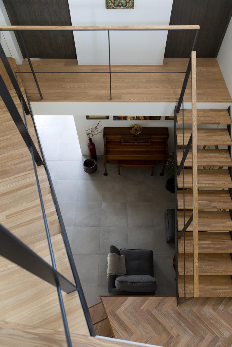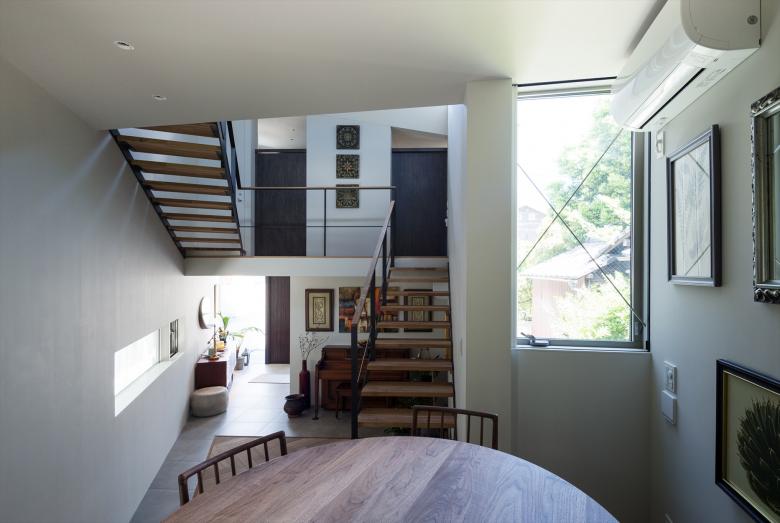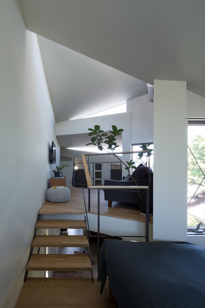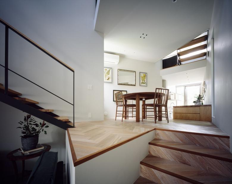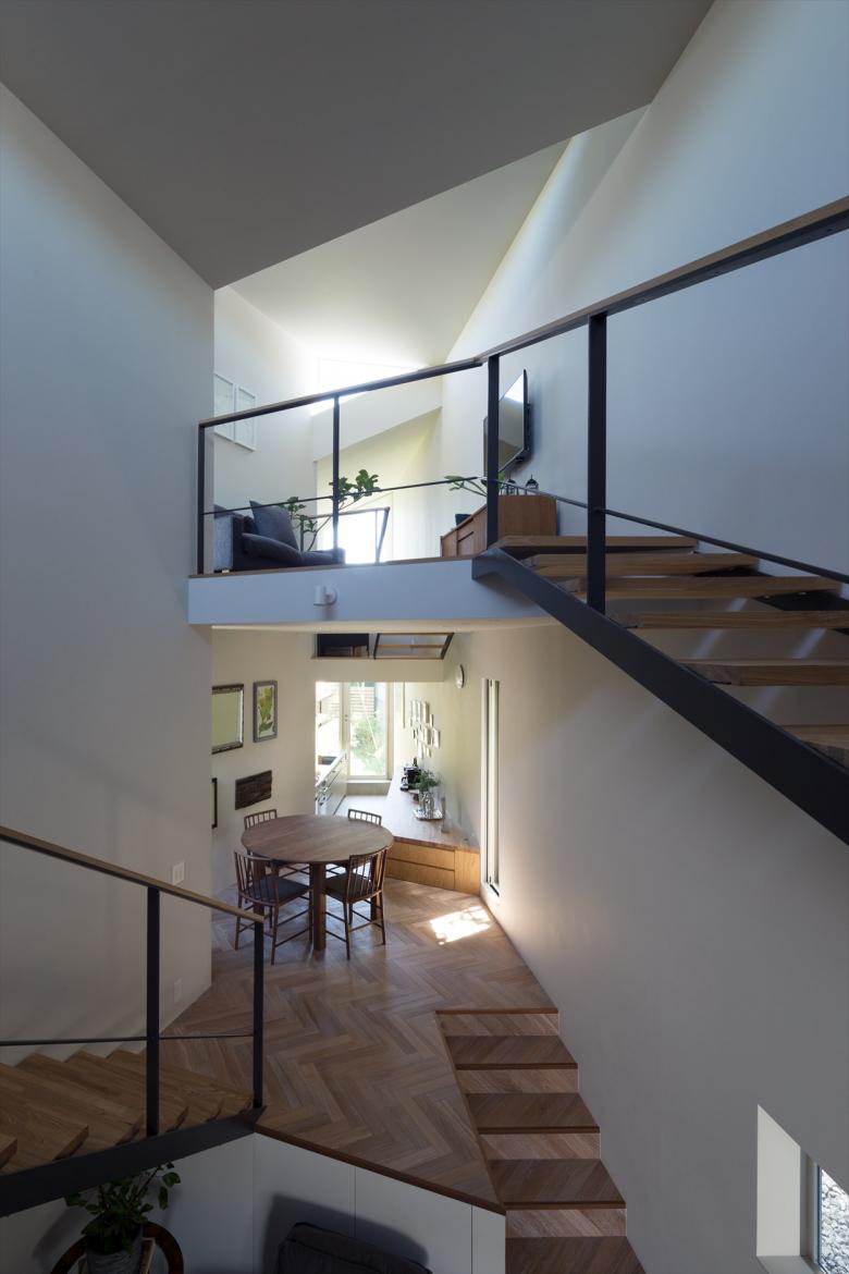 Gaps in the City - the house is built in a north-south elongated and distorted strip of land with the afterimage of uneven landscape with less than 2meter frontage at the shortest point. Towards the back of the site, the shed roofs of a row of four small blocks along the gently curving and narrowing site boundary, undulate in the east-west axis according to flashing and usability. Slight gable surfaces on the north-south formed by the block misalignment are openings, allowing light and wind to pass through. The space that narrows and curves towards the back encourages the visual extent.