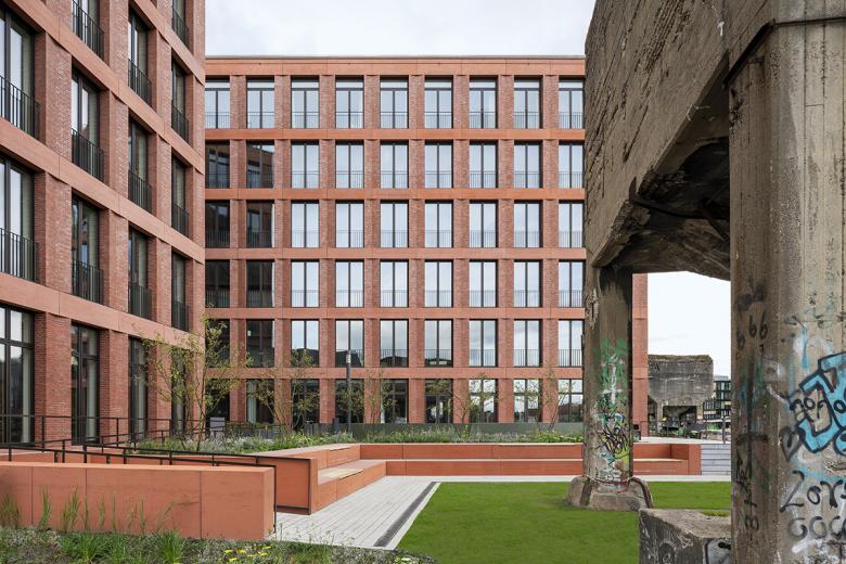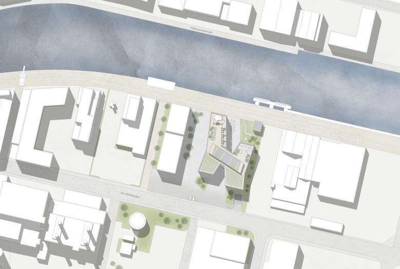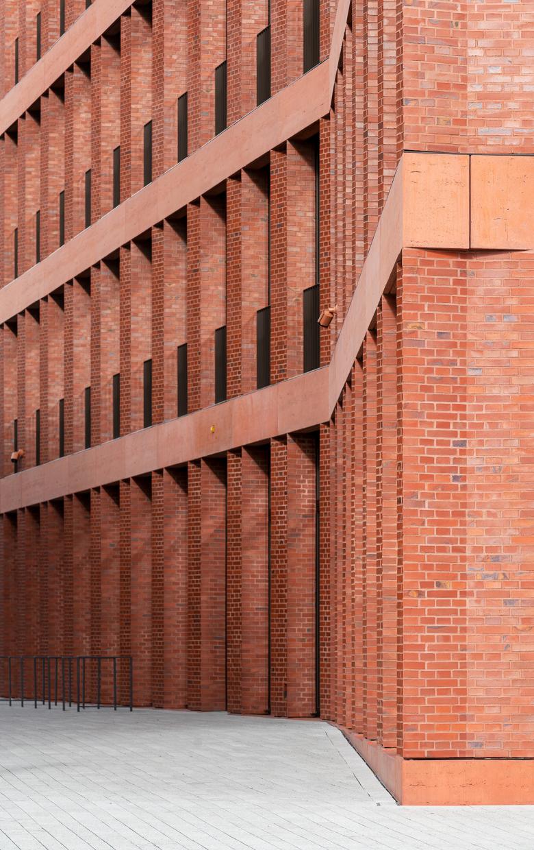 Das Hafenareal in Münster ist das wichtigste städtebauliche Entwicklungsgebiet und der attraktivste neue Anziehungspunkt der Stadt. Hier entsteht ein Hafenquartier, in dem sich moderne architektonische Solitäre zu einem lebendigen Ensemble zusammen finden. Der expressive Baukörper für Fiege Logistik und seine Partner schafft eine räumliche Verknüpfung mit seiner direkten Umgebung und empfängt mit seinen Gebäudeflügeln die Besucher und Nutzer des Hauses mit einladender Geste. Betritt man den leicht ansteigenden Campus, wird der Blick durch die großzügig verglaste Lobby, auf das Hafenbecken mit dem gegenüberliegenden Ufer geleitet.
