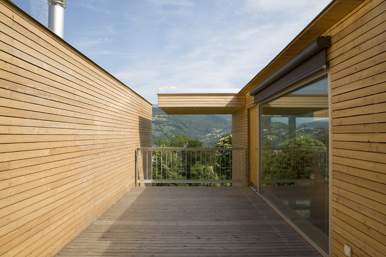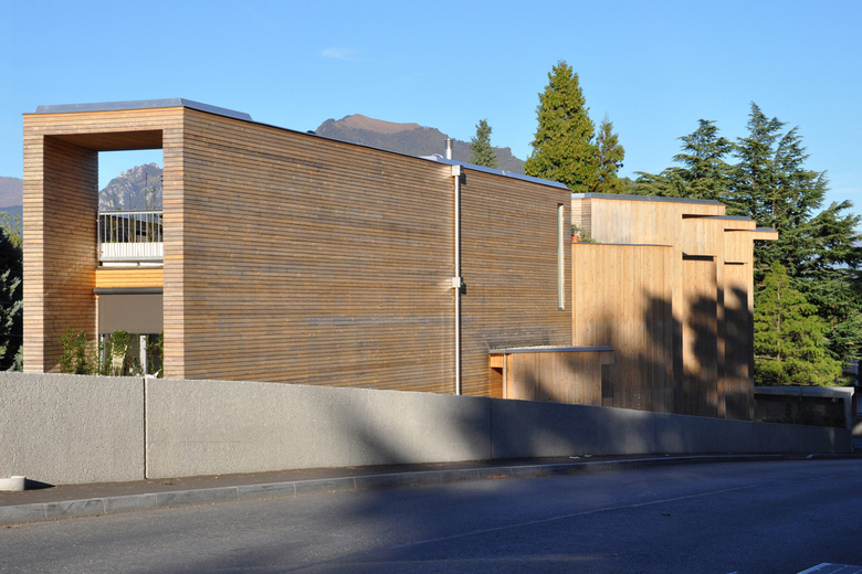 L’edificio è costituito da una costruzione prefabbricata in legno intelaiato, appoggiata su uno zoccolo in cemento armato che contiene l’autorimessa. Il rivestimento è di listelli orizzontali in douglasie grezze.