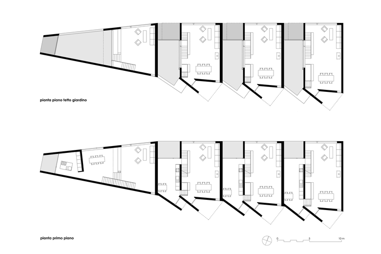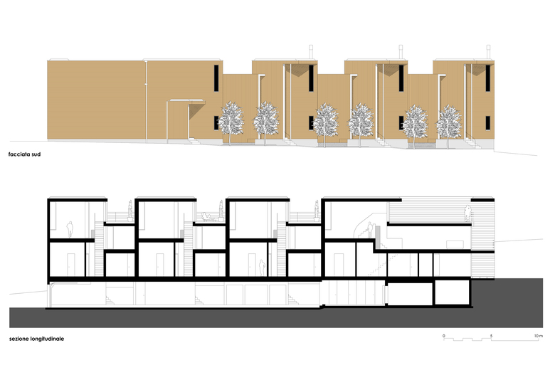 Il volume si articola verso la strada con delle parti inclinate a ventaglio e incavate, atte a creare un rapporto con la strada (entrate), a portare luce nei locali e a proteggere dalle emissioni della strada (camere); la parte superiore del volume è modulato con dei vuoti che creano dei tetti giardini e permettono di soleggiare l’interno degli appartamenti attraverso lo spazio verticale della circolazione.