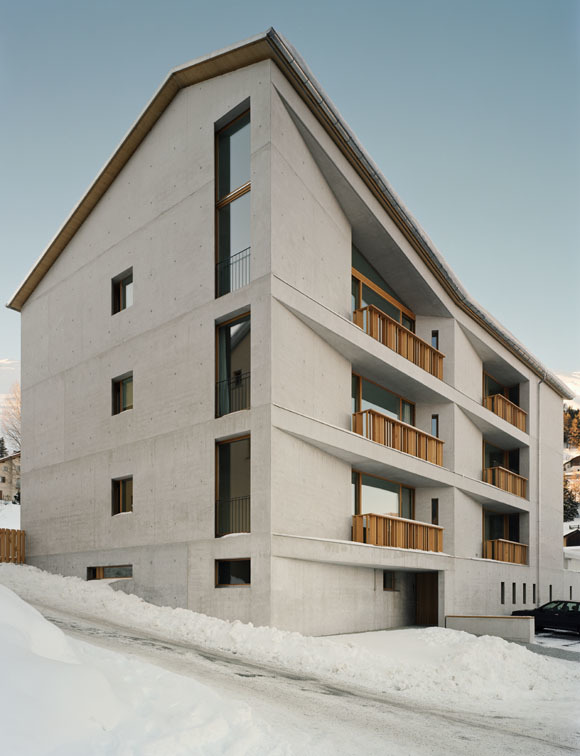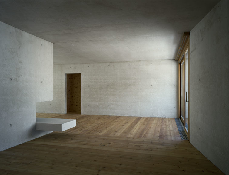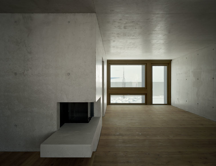 Le facciate rispecchiano la pianta: grandi finestre panoramiche in corrispondenza al soggiorno e finestre più piccole in corrispondenza alle camere. L‘edificio presenta una marcante conformazione plastica, conferitagli dallo spessore delle aperture e dal forte carattere murario del volume bianco. L‘edificio tematizza in parte elementi del luogo, soddisfa però anche le moderne esigenze in termini di luce, vista e spazio.