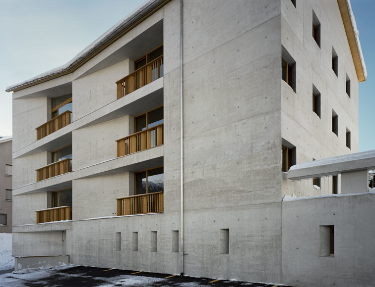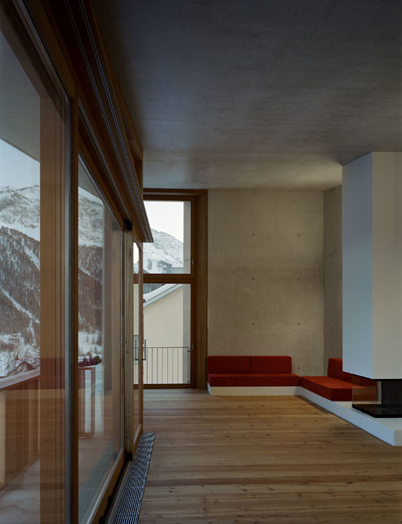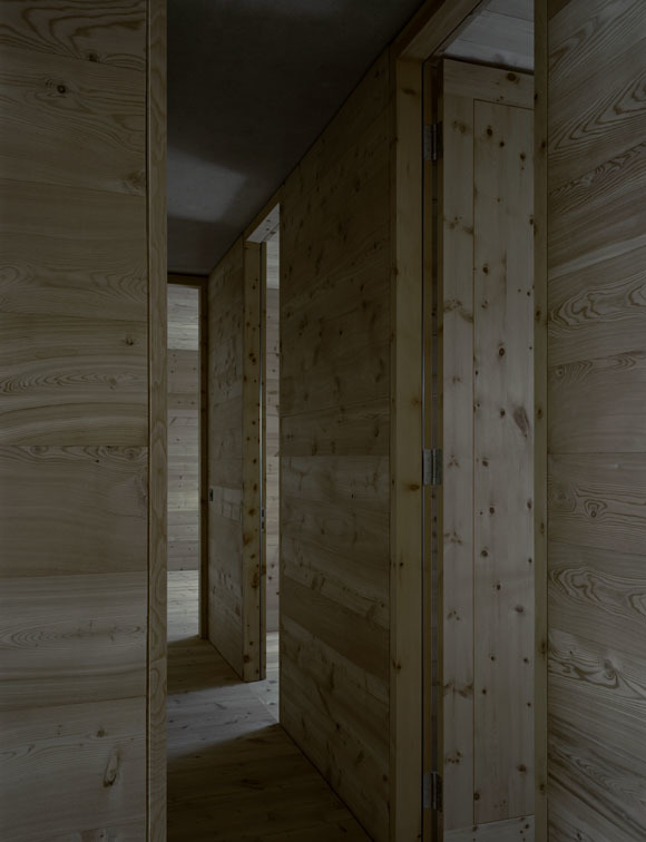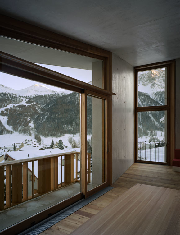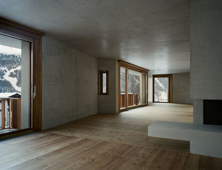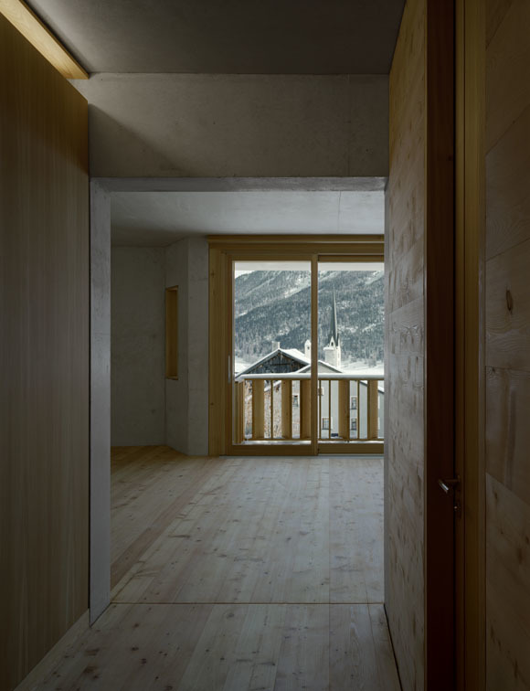 Un grande spazio traversante costituisce l‘elemento caratterizzante la tipologia abitativa e richiama il „suler“ tipico della casa engadinese tradizionale. Le camere si trovano in due corpi di legno più intimi e introversi. La pianta è flessibile e prevede di avere un solo grande appartamento su un piano con due zone notte, una padronale e una per gli ospiti, oppure due appartamenti per piano.
