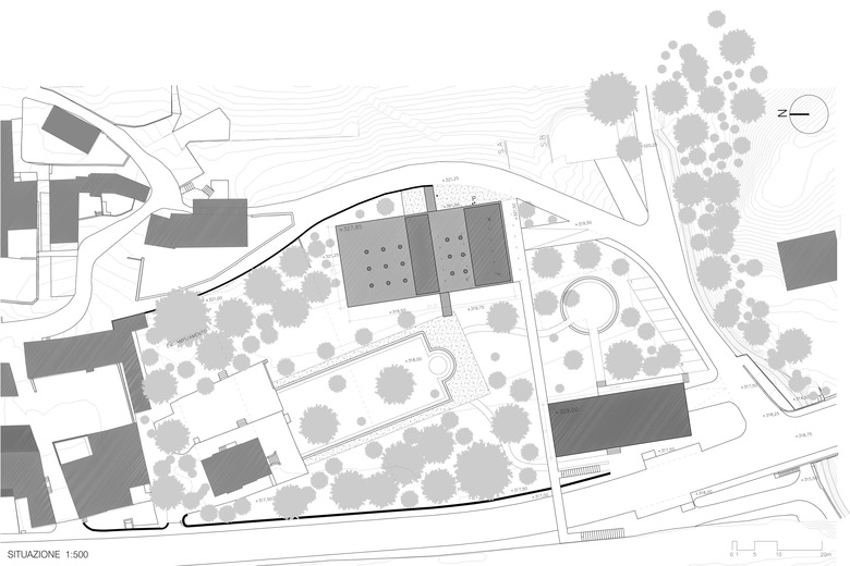 Si propone di mantenere il disegno del vecchio parco che attualmente va a cavallo della proprietà 232 e 233, in modo a mantenere l’unità e evitare una separazione derivante dal confine arbitrario. L’attuale alberatura viene mantenuta e completata come libera piantagione caratteristica di un parco ottocentesco attorno al disegno geometrico della parte centrale. Semplici camminamenti in ghiaietto frantumato calcare completano i passaggi necessari.