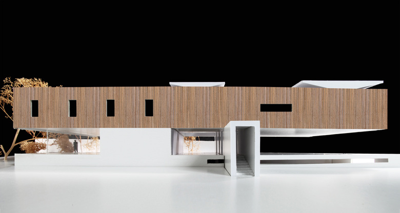 La parte bassa è in beton, compreso il pavimento che è previsto in cemento duro o in sasso, mentre il corpo sospeso è in legno. Il tetto è previsto con una sottile vegetazione di muschio di 5 cm con le parti sopraelevate in carta catramata ardesiata di colore rosso.