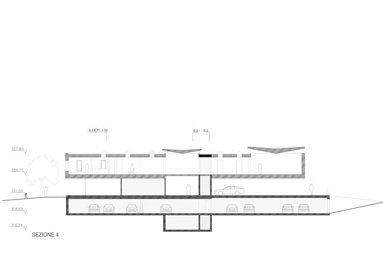 Il volume del posteggio che crea la piattaforma compreso le due lame e il corpo scale e ascensore che fungono da appoggio sono in cemento armato. Il volume sospeso è in legno, per la sua leggerezza, per le caratteristiche statiche e energetiche per quanto riguarda il valore dell’isolamento per l’ottenimento dello standard Minergie. Le due facciate principale costituiscono delle travi in legno lamellare massiccio di 320 mm spessore mentre quelle laterali e le pareti interne sono dei tralicci che portano le solette.