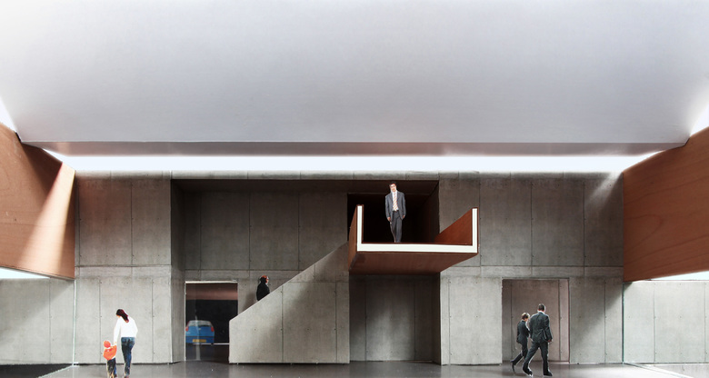 La piattaforma che viene a crearsi dalla costruzione del posteggio coperto funge da zoccolo del nuovo Centro Civico. Un volume sovrastante contiene in un unico piano tutte le funzioni dell’amministrazione comunale, uffici e sale. Lo spazio tra la piattaforma e il corpo sospeso forma un grande vuoto che ospita l’entrata al Centro Civico con atrio e posteggi, l’ufficio della polizia e il centro incontro diurno. Questi spazi sono aperti sul parco con ampie vetrate.