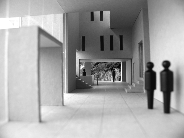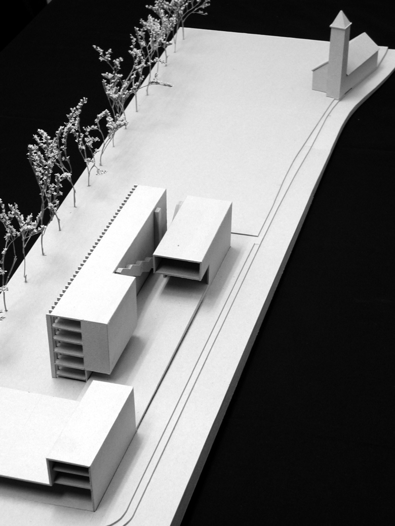 L’inserimento del progetto nel contesto avviene tramite una serie di muri e corpi paralleli alla valle. Si creano due situazioni distinte: uno spazio urbano verso la strada cantonale, uno spazio verde verso la pianura.