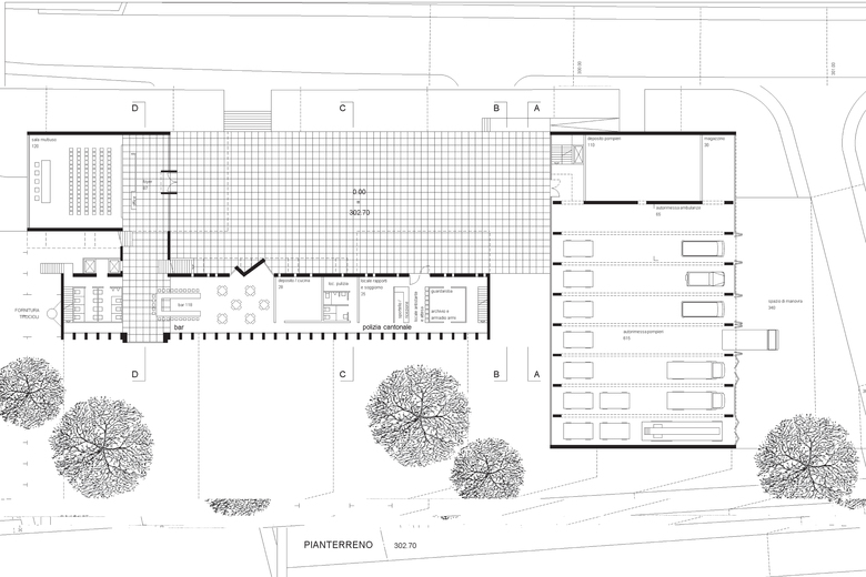 Un terzo volume, su tre piani, sempre in relazione con lo zoccolo, ospita uffici e spogliatoi dei pompieri, uffici e sala samaritani e locali della autolettiga; a questo corpo é annessa una copertura, adibita ad autorimessa per pompieri ed ambulanza. Antistante l’autorimessa giace il piazzale per le esercitazioni dei pompieri.