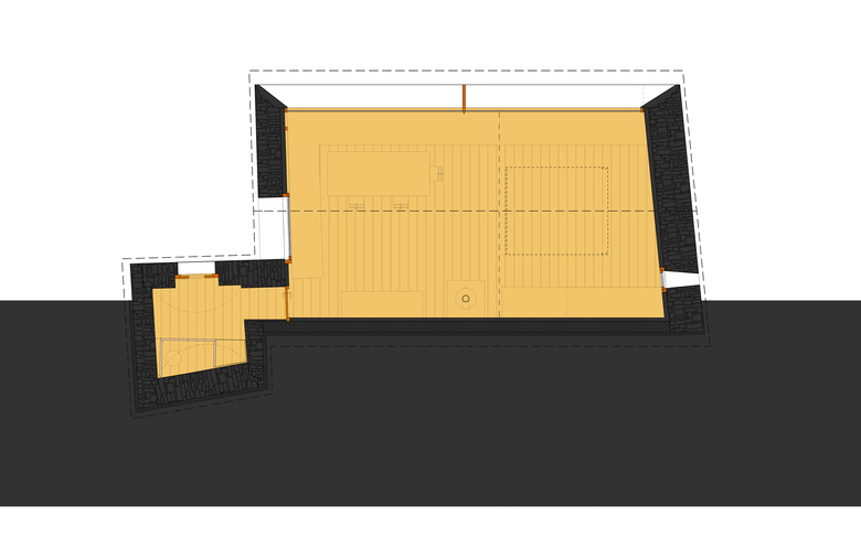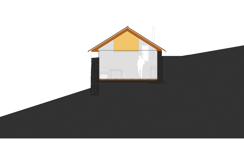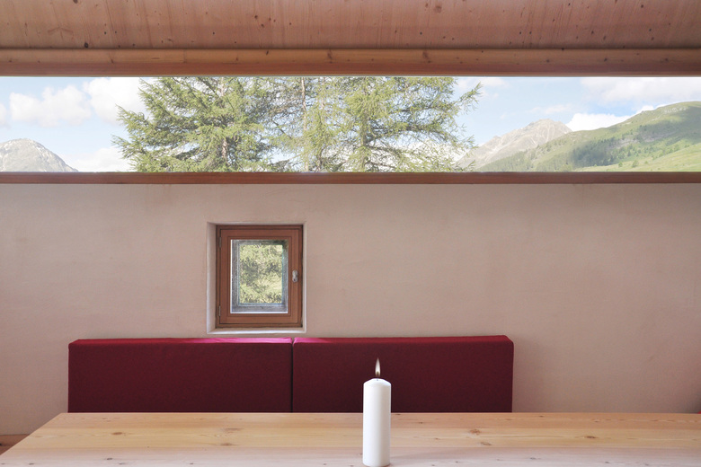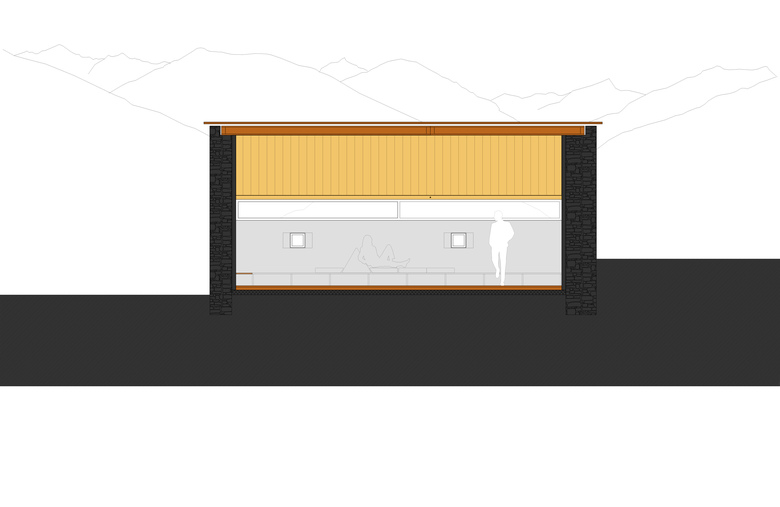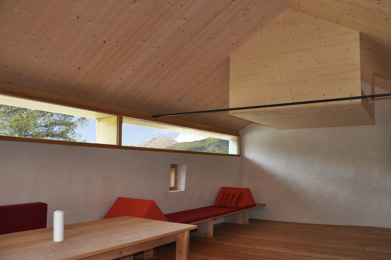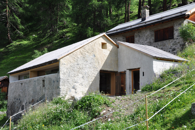 Vom Vieh nicht weiter genutzt, soll das alte Maiensäss bewohnbar werden. Die alten Mauern sollen unangetastet bleiben, räumlich soll es bei der Einheit bleiben. Ein neues Dach, um 30 cm gegenüber dem alten angehoben und unter Vermeidung der Fusspfette lässt gegenüber der alten Mauer einen horizontalen Spalt entstehen, auf der ganzen Länge des Gebäudes. Der Spalt wird zu einem Panoramafenster auf die Berggipfel und gibt dem Raum, was es nie hatte: Licht. Das aus zwei Platten bestehende Dach funktioniert als statisches Element, ein Faltwerk gehalten durch eine Zugstange. Zudem ist es eine Isolationsschicht. Das Bett hängt am Dach, der Raum bleibt ungeteilt von seinen vier Mauern definiert: altes Steingemäuer, unter einem aus Holzbrettern gedeckt Holzdach.
