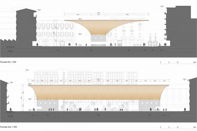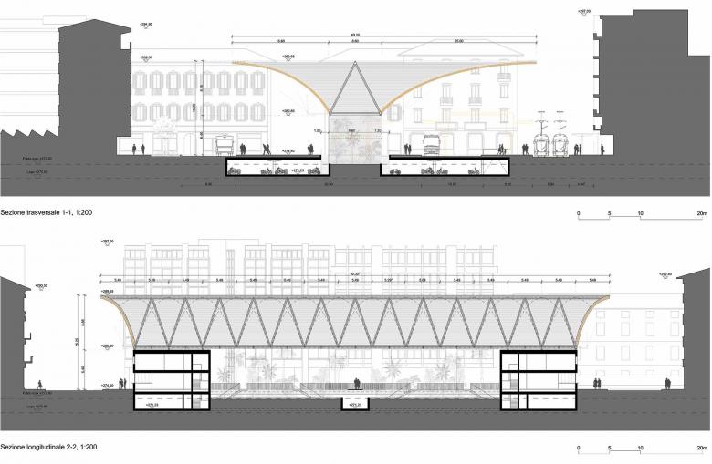 La copertura si appoggia su due volumi edili che contengono le funzioni richieste, su tre livelli (biglietteria TPL e ARL, polizia comunale, spazi commerciali …). Il vuoto centrale permette una relazione verticale tra gli elementi.