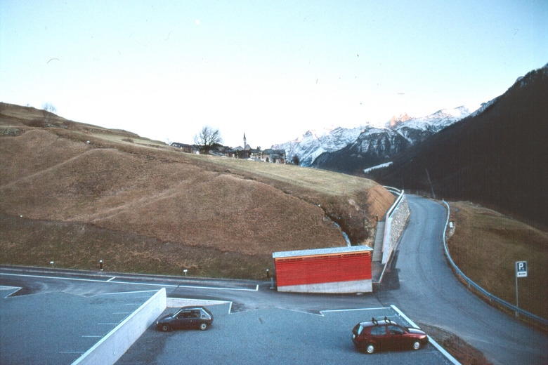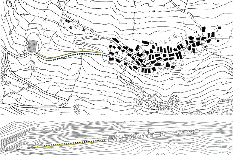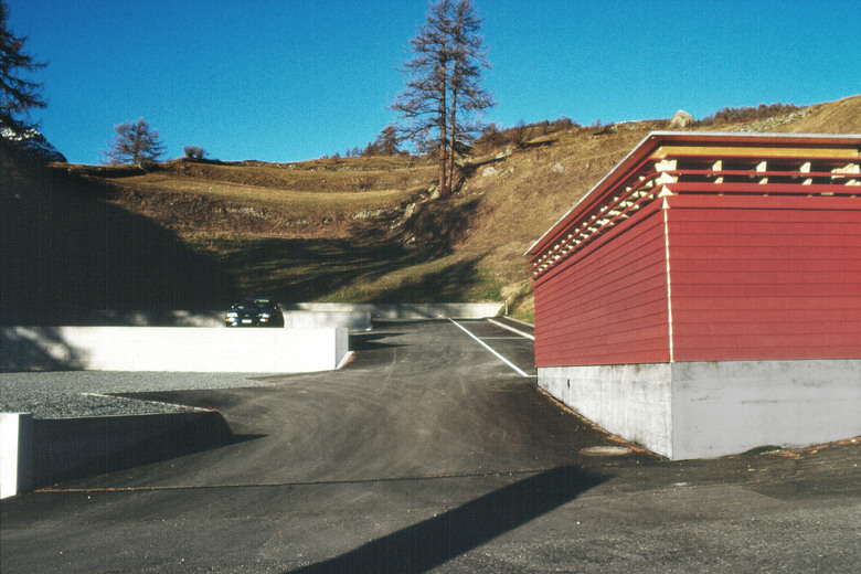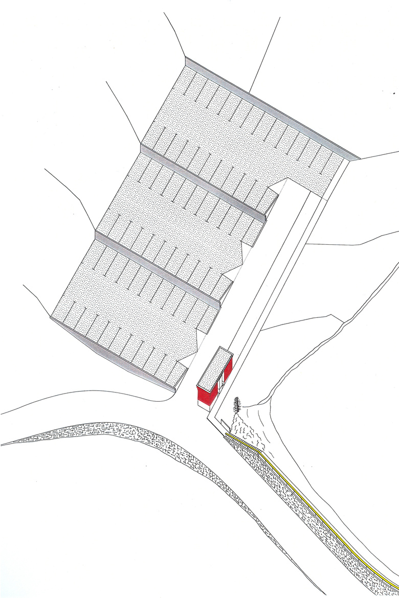 - Il posteggio, che si situa a 300 metri dal villaggio, inserendosi in una piccola valletta. Esso è formato da 4 muri in cemento armato, che creano 3 terrazzamenti, contrapposti al paesaggio per la loro geometria orizzontale e per la pavimentazione in ghiaia.