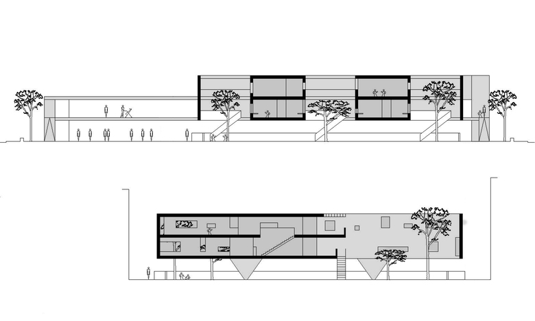 L’allineamento verso sud dell’edificio sospeso da terra con la scuola e la palestra crea un vasto spazio di carattere urbano, che conferisce un’identità pubblica alle scuole e al quartiere.