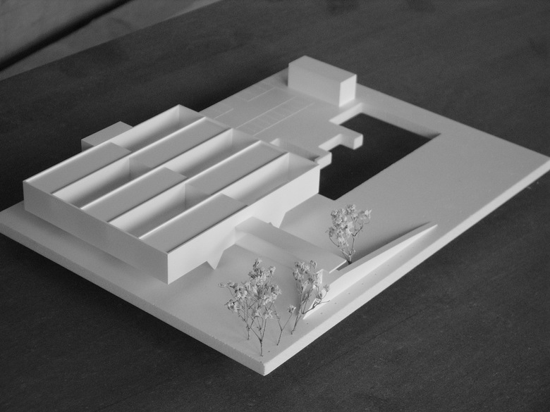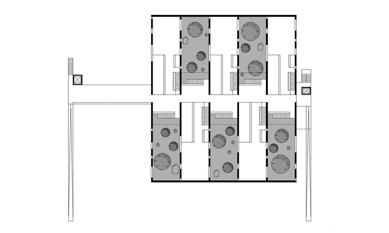 Una strada sopraelevata dà accesso alle singole unità passando dalle corti al 1° piano. Al 2° piano si trovano le aule delle attività di movimento (4 aule per le 5 unità) e i refettori inseriti in uno spazio continuo ritmato da nicchie che si aprono sulle terrazze / corti. La disposizione genera unità separate all’interno di un insieme.
