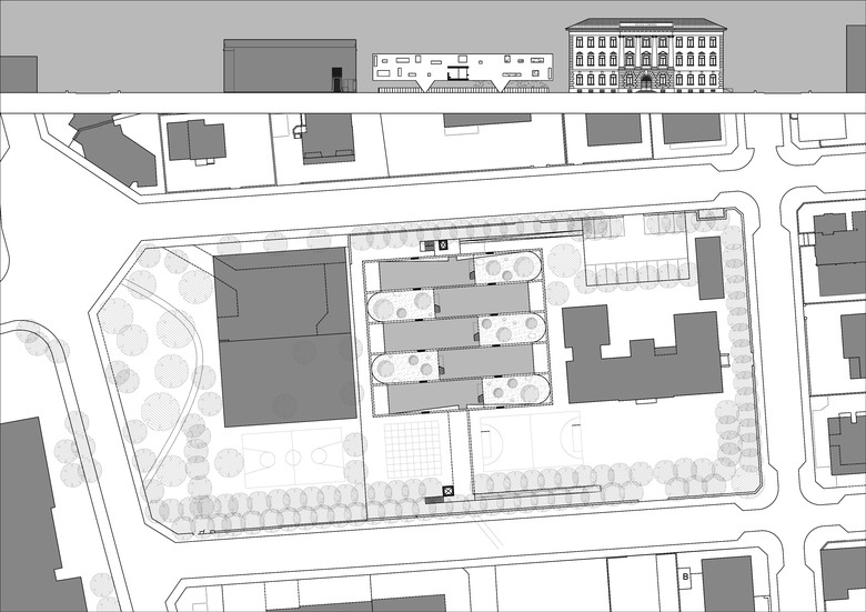 Una scuola dell’infanzia é caratterizzata da una grande superficie esterna tipo giardino dove i bambini possono giocare assieme in sicurezza, protetti da un recinto. Il sedime della scuola in concorso è un lotto urbano con diverse funzioni scolastiche e pubbliche per il quartiere. Nell’intento di fare un uso parsimonioso del limitato terreno a disposizione si propone la sovrapposizione dell’edificio contenente le varie funzioni richieste al parco giardino, declinando una continuità spaziale di parco in un contesto urbano. Lo sfasamento delle 5 singole unità produce delle corti alle quali si relaziona l’interno delle aule e che definisce il parco creando parti coperte e parti scoperte.