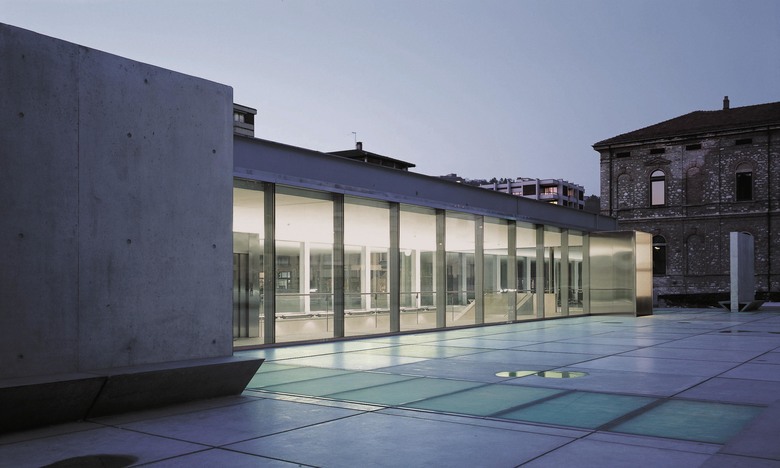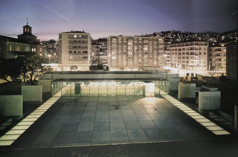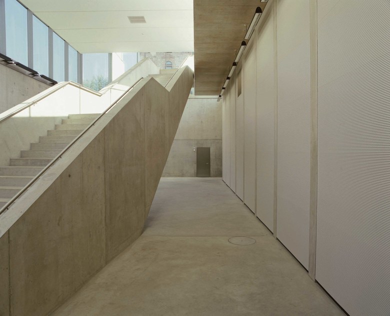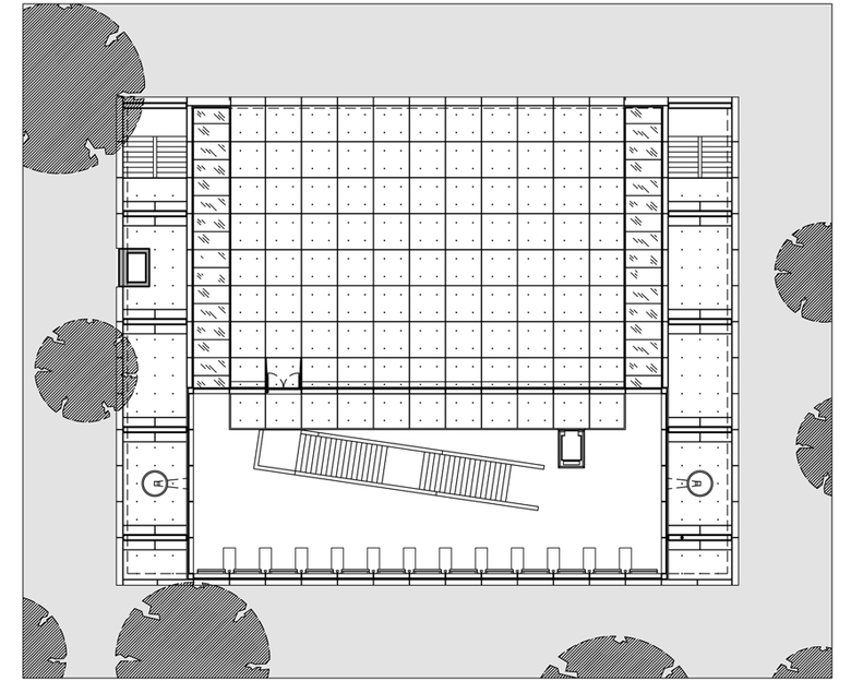 Al fine di mantenere l’angolo a sud-ovest del parco libero da costruzioni ingombranti e non pregiudicare la continuità del parco, l’aula magna viene interrata. Costruzione interrata non equivale però a costruzione sotterranea: gli spazi interni comunicano visivamente con il parco. A livello del parco la copertura della sala, pavimentata, diventa una piazza circondata da alberi.