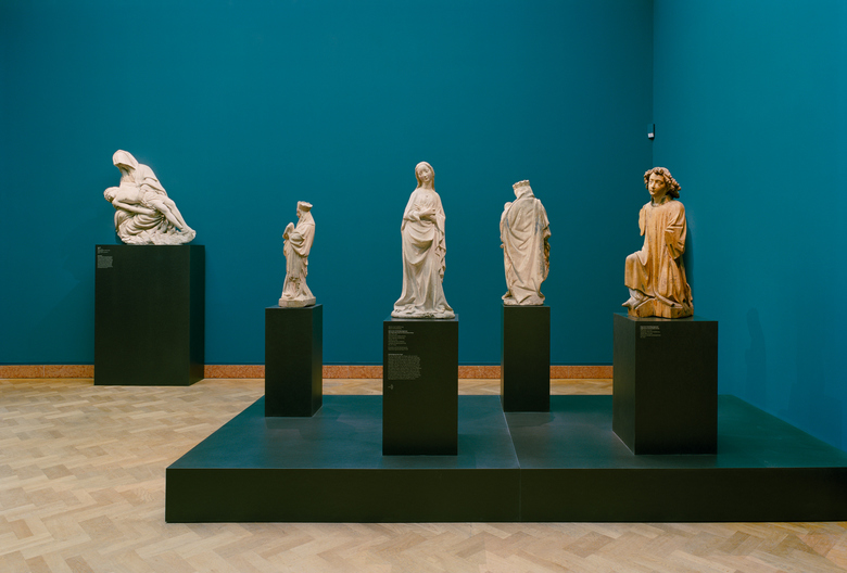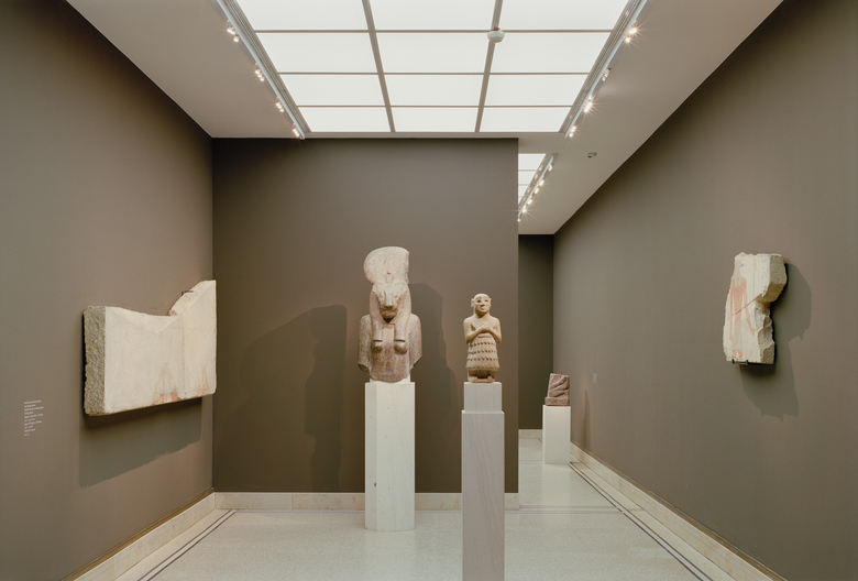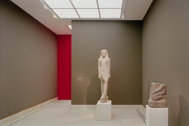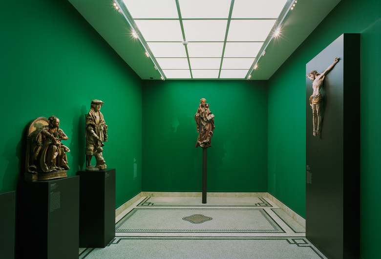 The 19th-century villa and its later gallery extensions can now be experienced as a place of collection and research. The former upper-floor rooms of the villa, with their partially built-in furnishings, have been reclaimed as studioli. In this way the rooms themselves, together with the exhibits, also exhibit collection and research in the 19th century. The exhibition route is de-musealised into the structure of the private house through its spatial reduction. In doing so, the coloured design of the walls accomplishes a rhythm that makes the passage through the exhibits structured and memorable. Compared to the former exhibition, the exhibits now appear much brighter, though the light intensity remains unchanged: the previously white background has been replaced by walls whose colouring varies from warm grey to, in parts, intensively luminescent tones.