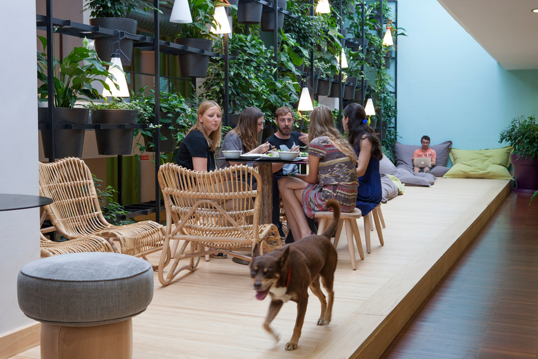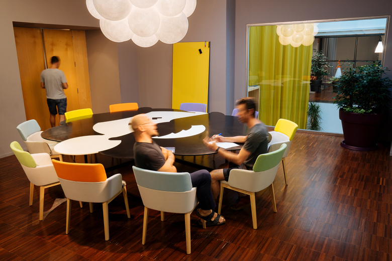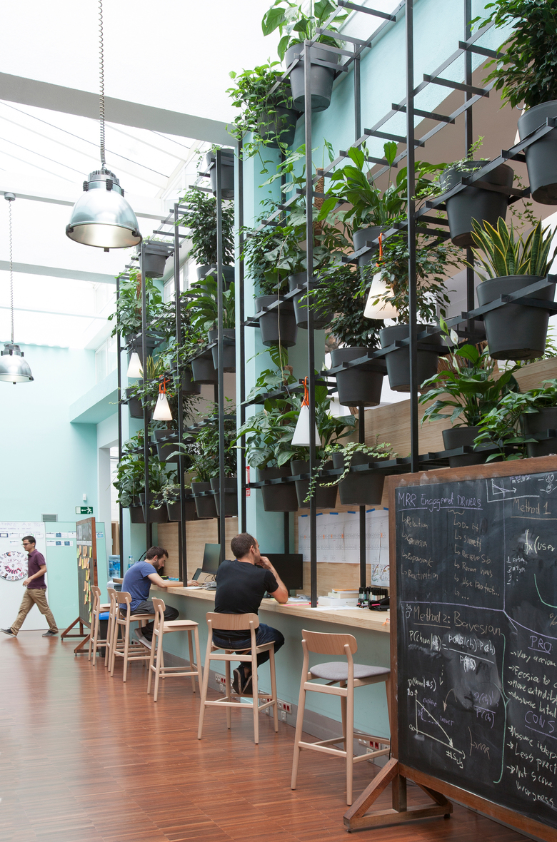 Typeform’s headquarters were to be provided of fresh air and free mobility. The solution came hand in hand with Kamal Meattle, a NASA specialist, according to whom there exists a specific combination of plants capable of renewing interior space’s air. We designed the holding structures and distributed 810 items of these species, as well as a gardener on staff. We paired the idea with a space redistribution around a boulevard where to meet, eat or chill. With the notion of reducing the office to a laptop, Typeform has been designed to have the freedom of choosing where to work, whether at the table, discussing in an agora, lying on the hammocks or having a beer at the bar-reception. In Typeform it is eaten comfortably, it is worked in multiple formats and spaces are merged with working rooms adapting to concrete profiles. It isn’t an office, and if it resembles one, we’ve utterly failed.