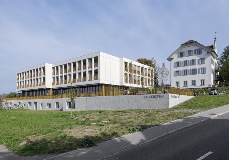 Der Erweiterungsbau ergänzt die ehemalige Fabrikantenvilla und einen später hinzugekommenen Zimmertrakt zu einem Ensemble mit vielfältigen Aussenräumen. Das Sockelgeschoss aus gestocktem Beton bildet eine umlaufende Gartenterrasse vor dem verglasten Eingangsgeschoss. Als vielseitig bespielbares Raumkontinuum wird dieses zum Mittelpunkt der Altersresidenz. Der auf das Eingangsgeschoss aufgesetzte Kubus mit den Pflegestationen besteht - passend zur Putzfassade der Villa - aus gelblichem Kalkbeton.