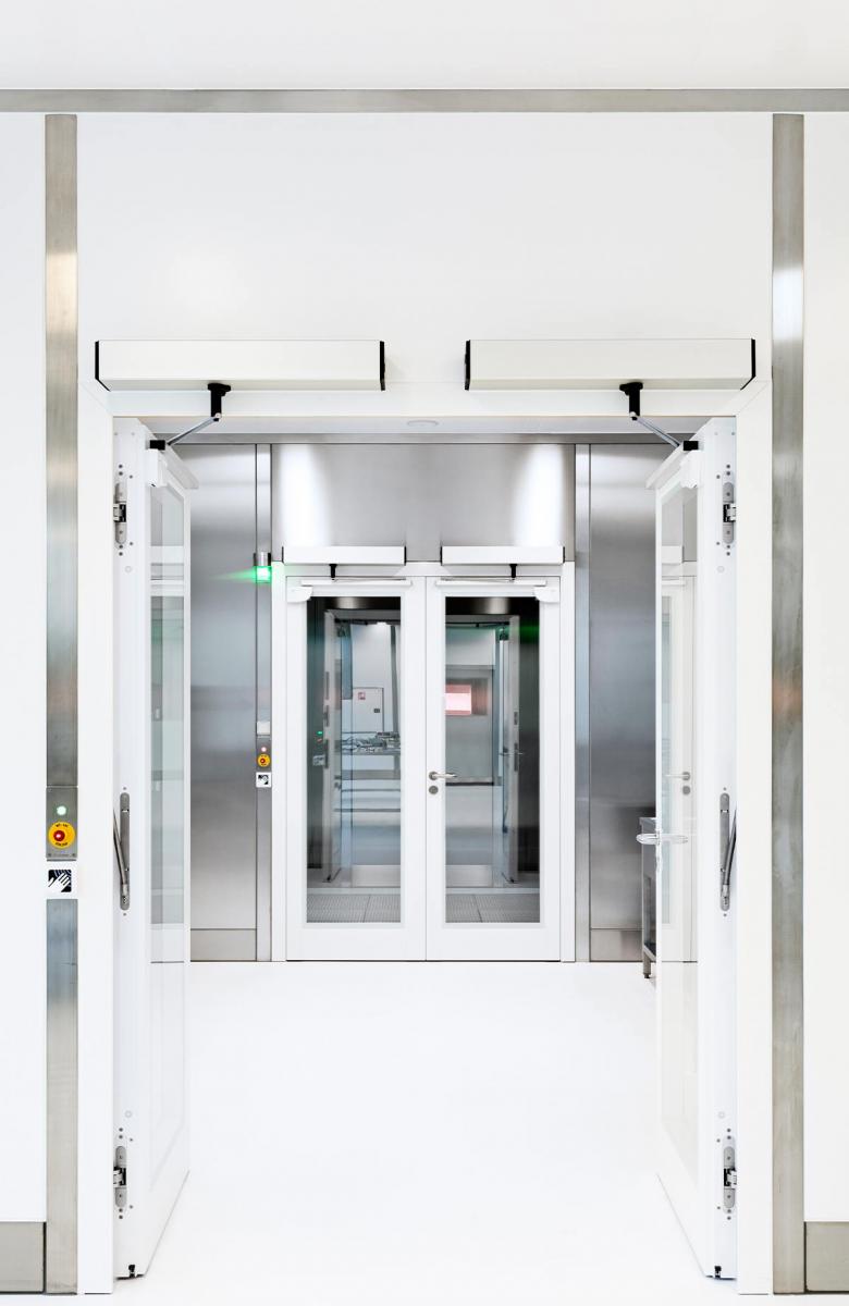 Die Wandschalen bestehen aus hochwertigem Edelstahl: Das Lindner Wandsystem Pharma 80S ist teilweise mit Duploschliff und teils mit weißer RAL 9003-Pulverbeschichtung ausgeführt. Im Abstand von 1.200 mm werden die Wandschalen von Edelstahlpfosten unterbrochen, wodurch sich ein stimmiges Gesamtbild ergibt. Mit automatischem Antrieb und Schleusensteuerung sorgt das flächenbündig integrierte Türsystem Swing Pharma 80 für Zugang zu den Reinräumen. Das Verriegelungssystem Inline 2 verriegelt die Türsysteme in den Personenschleusen gegeneinander und senkt so das Risiko von Kreuzkontaminationen. Zudem verbaute Lindner Schnelllauftore von Assa Abloy. Für zusätzliches Licht sorgen Glaseinsätze in Trennwänden und Türsystemen.