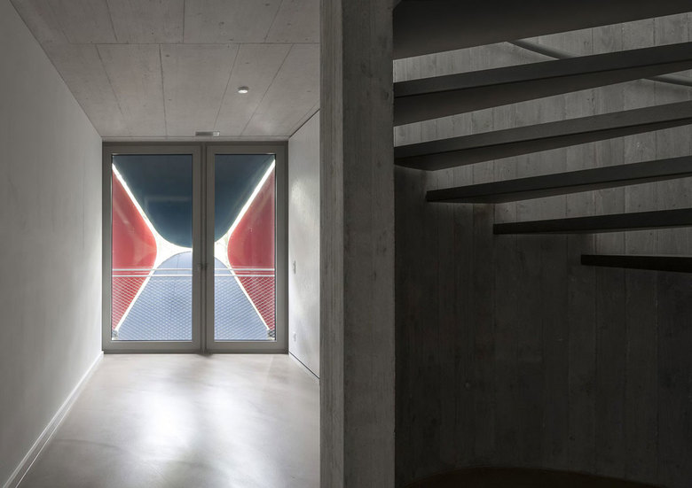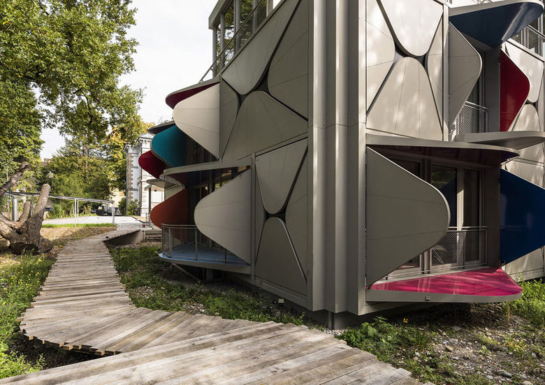 Das aussergewöhnliche Erscheinungsbild des Gebäudes wird massgeblich durch das sogenannte „Ballet Mécanique“ bestimmt, eine vor der Verglasung installierte zweite Fassadenebene mit beweglichen Elementen, die als vorgehängte Stahlleichtbaukonstruktion mit Hydraulikantrieben ausgeführt wurde. Balkonplatten, Vordächer, Fensterläden wie auch die erforderlichen Geländer sind Teil der Mechanisierung des „Ballets“. Den Nutzerbedürfnissen folgend können diese Elemente wahlweise geschlossen sein und teilweise oder vollständig geöffnet werden, bis die Zugänglichkeit der Balkone erreicht ist.
