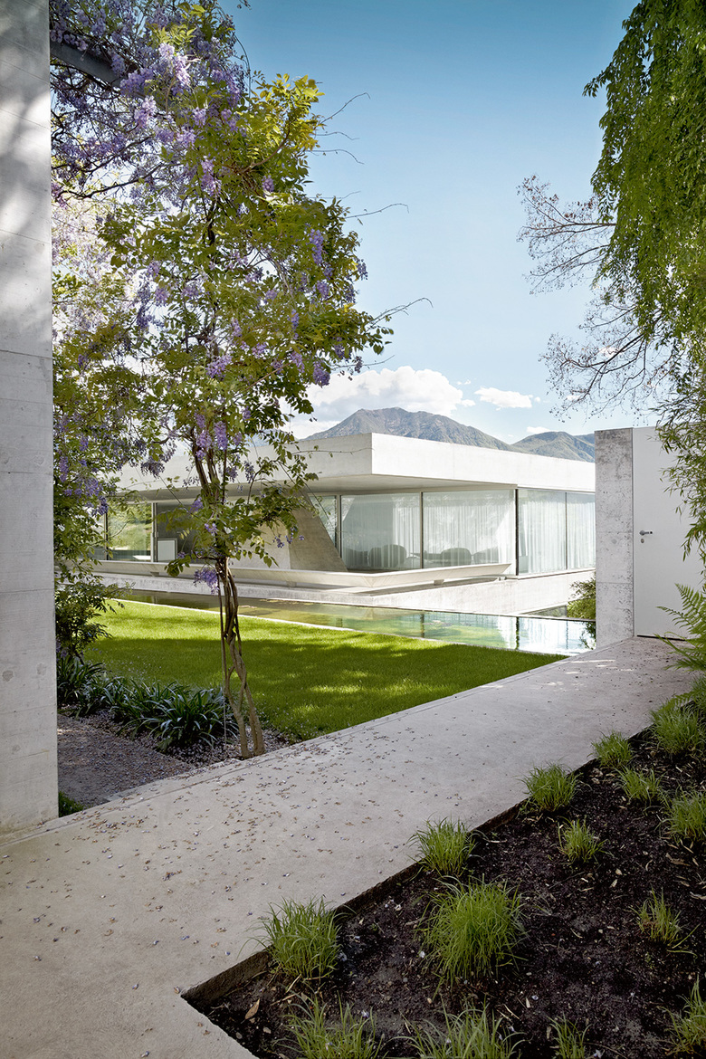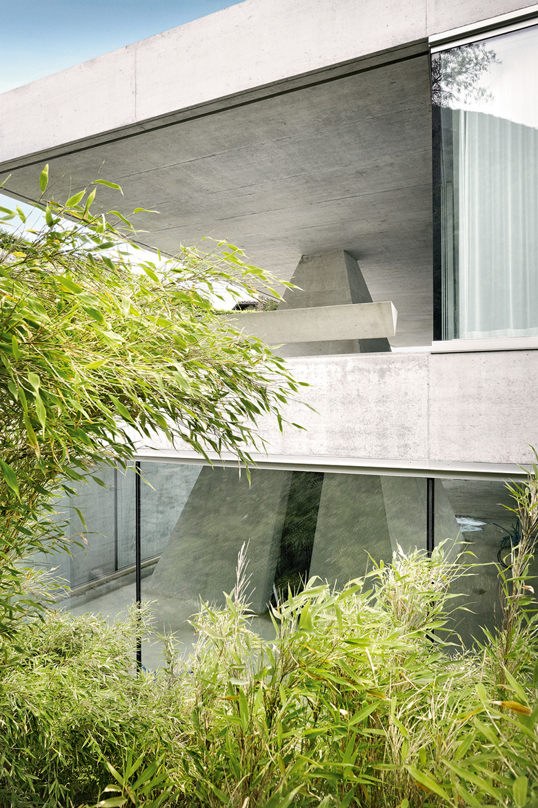 Die skulptural anmutende Casa ai Pozzi in Minusio präsentiert sich als “eine starke Einheit von Struktur und architektonischer Idee, die von den Architekten und Bauingenieuren von Anfang an gemeinsam entwickelt wurde” (Jurybericht BETON13). Die zwei entgegengesetzt gerichteten Pyramiden bilden die Kernelemente des Tragwerks. Sie übernehmen die vertikalen Lasten der zwei vorgespannten Stahlbetondecken. Die beiden vertikalen Tragelemente sind zentralsymmetrisch im Grundriss angeordnet und erzeugen ein räumliches Rahmensystem. Dieses gewährleistet die Stabilisierung gegenüber Horizontalkräften. Das statische System ist durch zwei ideelle Gelenke in den Pyramidenspitzen gekennzeichnet. Ohne die stabilisierende Wirkung der Decke über dem Erdgeschoss würde das System um die Rotationsachse, welche die zwei Gelenke verbindet, kippen. Die Geschossdecken kragen bis ca. 7m frei aus und sind als Hohlkörperdecken konzipiert. Die Vorspannung ist kreuzweise in den Grundrissdiagonalen angeordnet und bezweckt die Reduktion der Verformungen.
